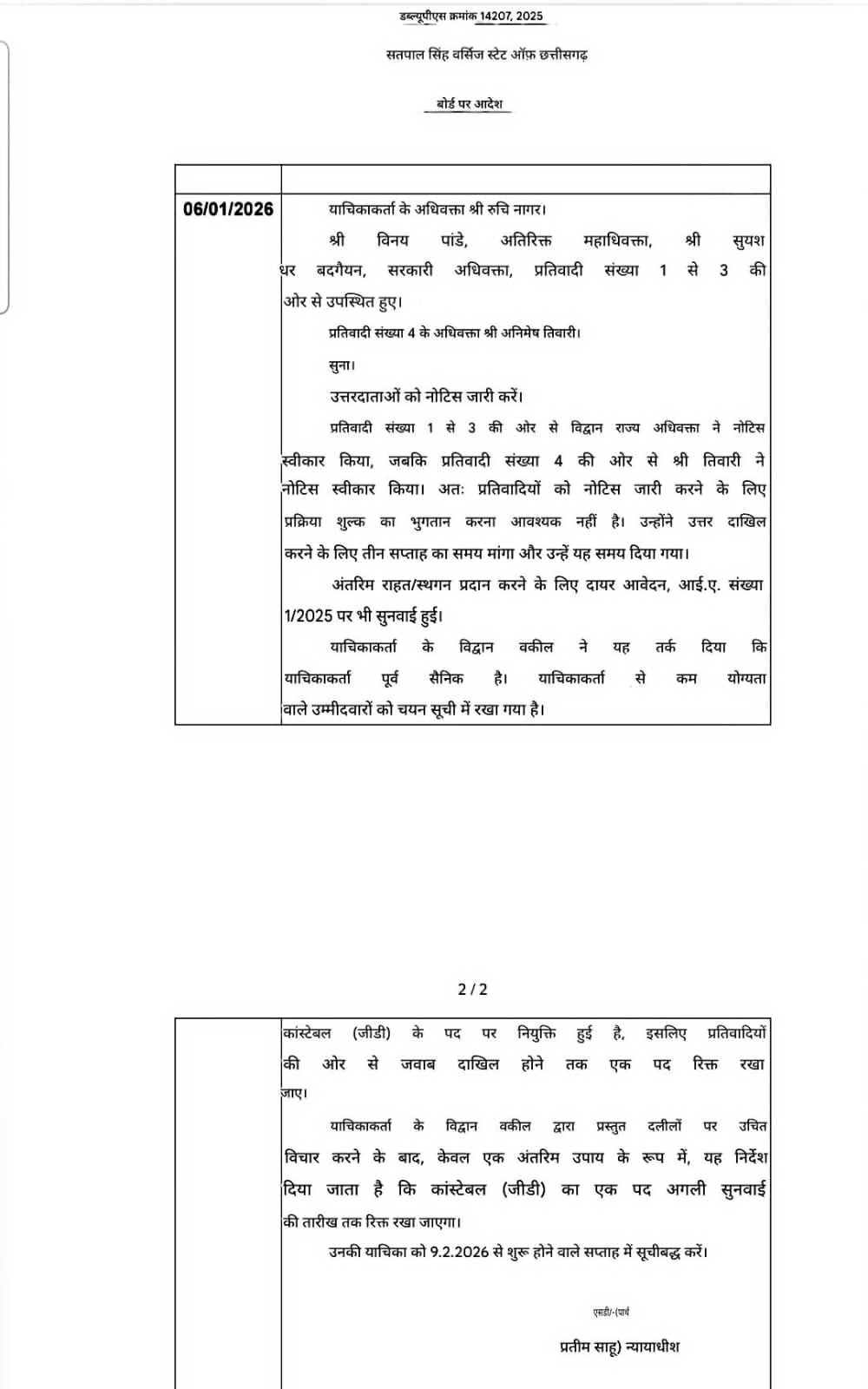 बिलासपुर 13 जनवरी 2026:- मामला पुलिस विभाग में चल रही आरक्षक-भर्ती से संबंधित है, जिसके याचिकाकर्ता सतपाल सिंह, दिनेश कुमार साहू एवं अनिल कुमार सिन्हा हैं, जो कि भूतपूर्व-सैनिक हैं। समस्त पात्रता रखते हुए वे भर्ती प्रक्रिया में शामिल हुए, दस्तावेज़ जांच के पश्चात दुर्ग जिले में शारीरिक दक्षता परीक्षा पास की और लिखित परीक्षा में भी शामिल हुए।