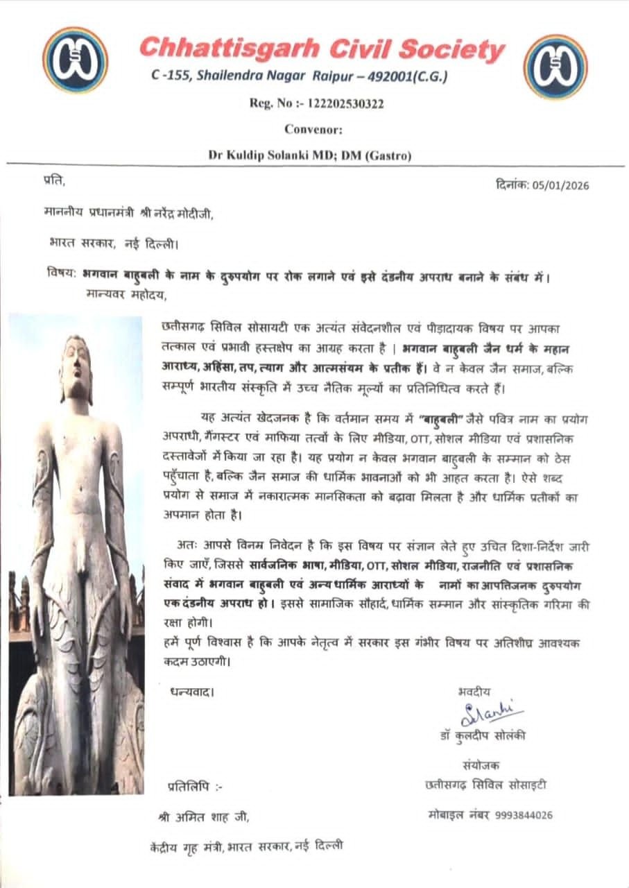 छत्तीसगढ़ सिविल सोसायटी के संयोजक डॉ. कुलदीप सोलंकी ने पत्र में आग्रह किया है कि सरकार इस गंभीर विषय पर संज्ञान ले और स्पष्ट दिशा-निर्देश जारी करे। इन निर्देशों के माध्यम से सार्वजनिक भाषा, मीडिया, ओटीटी, सोशल मीडिया, राजनीति और प्रशासनिक संवाद में भगवान बाहुबली एवं अन्य धार्मिक आराध्यों के नामों के आपत्तिजनक दुरुपयोग को दंडनीय अपराध घोषित किया जाए।