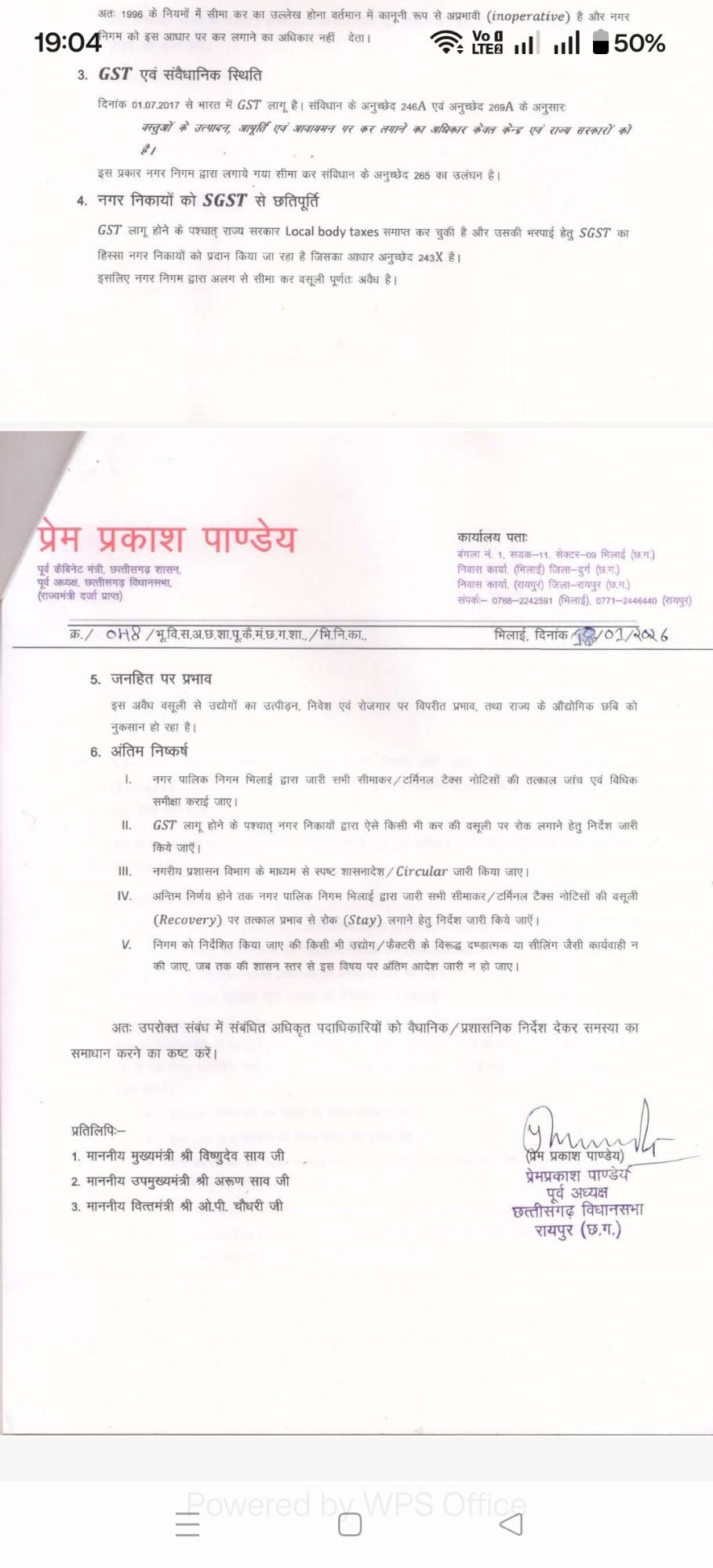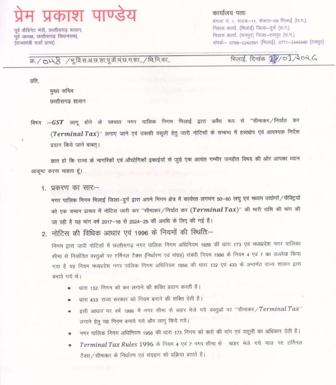 भिलाई नगर 18 जनवरी 2026:-  छत्तीसगढ़ विधानसभा के पूर्व अध्यक्ष प्रेमप्रकाश पाण्डेय ने राज्य के मुख्य सचिव को पत्र लिखकर नगर पालिक निगम भिलाई द्वारा जारी किए गए सीमाकर/निर्यात कर (टर्मिनल टैक्स) नोटिसों पर तत्काल हस्तक्षेप की मांग की है। उन्होंने कहा कि जीएसटी लागू होने के बाद भी निगम द्वारा उद्योगों पर कर लगाना गंभीर विषय है और इससे प्रदेश की औद्योगिक छवि को नुकसान पहुँच रहा है।  पाण्डेय ने मुख्यमंत्री विष्णुदेव साय, उपमुख्यमंत्री अरूण साव एवं वित्तमंत्री ओपी चौधरी को प्रतिलिपि के माध्यम से इस विषय से अवगत कराया है।