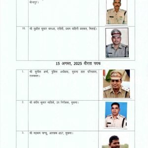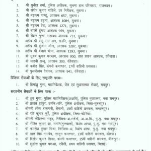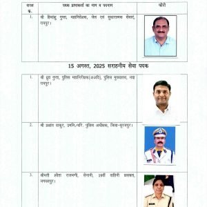 रायपुर 14 अगस्त 2025:- भारत शासन, गृह मंत्रालय, नई दिल्ली से प्राप्त जानकारी के अनुसार स्वतंत्रता दिवस, 2025 के अवसर पर महामहिम राष्ट्रपति द्वारा छत्तीसगढ़ पुलिस विभाग के निम्नलिखित अधिकारियों/ कर्मचारियों को वीरता पदक, विशिष्ट सेवा पदक एवं सराहनीय सेवा पदक से विभूषित किये जाने की घोषणा की गई हैः-