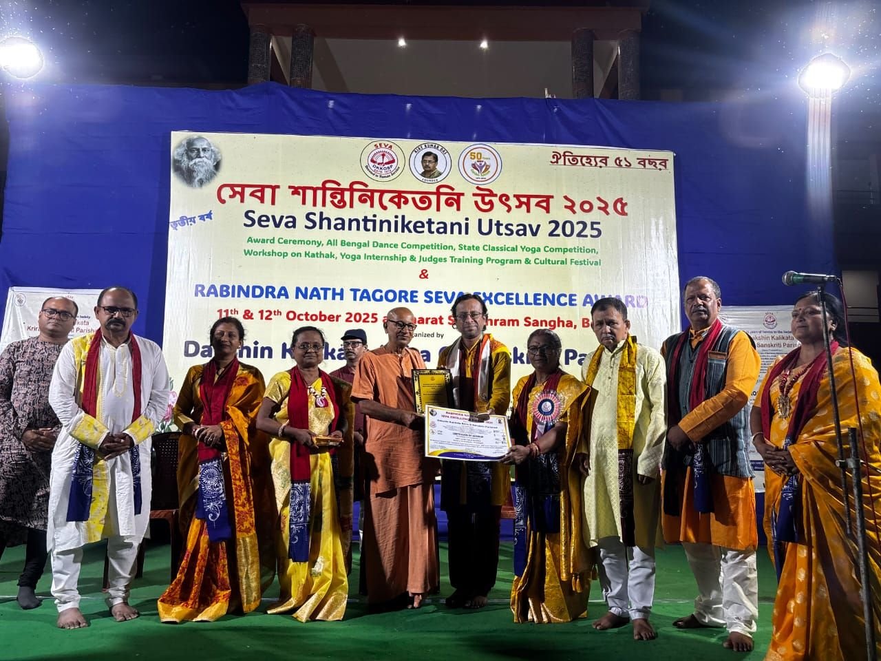 भिलाई नगर 16 अक्टूबर 2025:- – छत्तीसगढ़ भिलाई की प्रशिक्षण एवं रवीन्द्र संस्कृति पर कार्यरत संस्था गीत वितान कला केन्द्र (स्कूल आफ परफारमीग आटर्स ) को शांतिनिकेतन बोलपुर पश्चिम बंगाल में रवीन्द्रनाथ टैगोर एक्सीलेंस अवार्ड 2025 मे सम्मानित किया गया । संस्था द्वारा समिति के आठ सदस्य गण को सेवा शांति निकेतन उत्सव 2025 में कला एवम् रवींद्र सस्कृति के क्षेत्र में उल्लेखनीय कार्य हेतु ” रवीन्द्रनाथ टैगोर एक्सीलेंस अवार्ड प्रदान किया गया । जिसे भारत सेवा संघ के प्रमुख महाराज स्वामी अदवैतानन्दजी , विश्व भारती विश्वविद्यालय बोलपुर शांति निकेतन क्रीड़ा अधिकारी तापोश सान्याल, ओडिशी नृत्य गुरु अपूर्व चक्रवर्ती के द्वारा प्रदान किया गया ।