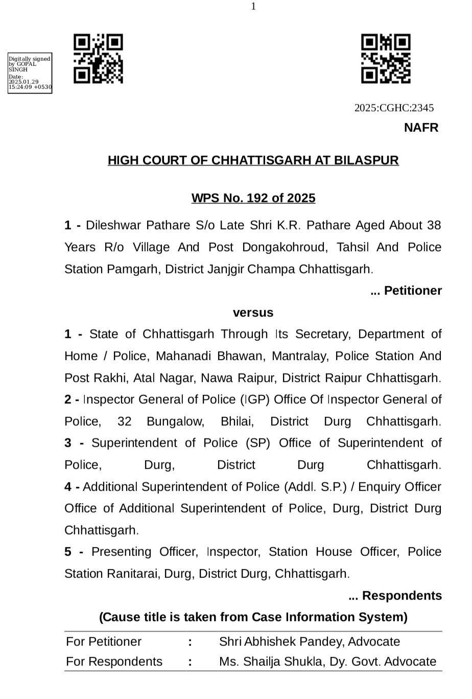 बिलासपुर 01 फरवरी 2025:- हाईकोर्ट आपराधिक मामला एवं विभागीय जांच नहीं चल सकते एक साथ पामगढ़, जिला-जांजगीर चाम्पा निवासी डी.एल. पठारे पुलिस थाना-पाटन, जिला-दुर्ग में पुलिस विभाग में आरक्षक(कांस्टेबल) के पद पर पदस्थ था। उक्त पदस्थापना के दौरान 10 सितम्बर 2024 को उसके विरूद्ध पुलिस थाना-पाटन में एक अपराध पंजीबद्ध किया गया एवं थाना प्रभारी, पाटन द्वारा न्यायालय में चालान प्रस्तुत किया गया।