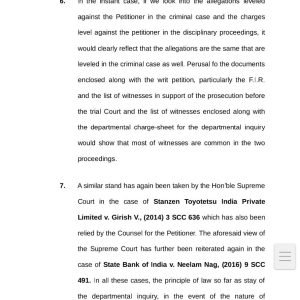 दोनों कार्यवाही में अधिकांश अभियोजन साक्षी (गवाह) समान हैं, अतः यदि आपराधिक मामले से पूर्व विभागीय जांच में गवाहों का परीक्षण कर लिया जाता है तो इसे याचिकाकर्ता के बचाव पर प्रतिकुल प्रभाव पड़ेगा जिससे याचिकाकर्ता को नुकसान होगा,