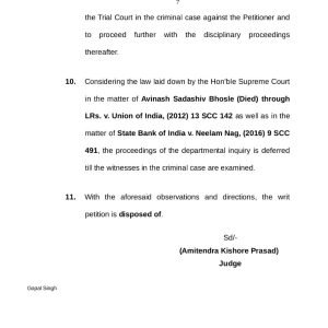 नैसर्गिक एवं प्राकृतिक न्याय का उल्लंघन होगा। अतः गवाहों का सर्वप्रथम आपराधिक मामले में परीक्षण किया जाना आवश्यक है। उच्च न्यायालय, बिलासपुर द्वारा उक्त रिट याचिका की सुनवाई के पश्चात् रिट याचिका को स्वीकार कर याचिकाकर्ता के विरूद्ध आपराधिक मामले में गवाहों का परीक्षण होने तक विभागीय जांच कार्यवाही पर पूर्ण रूप से रोक (स्थगन) कर दिया गया।