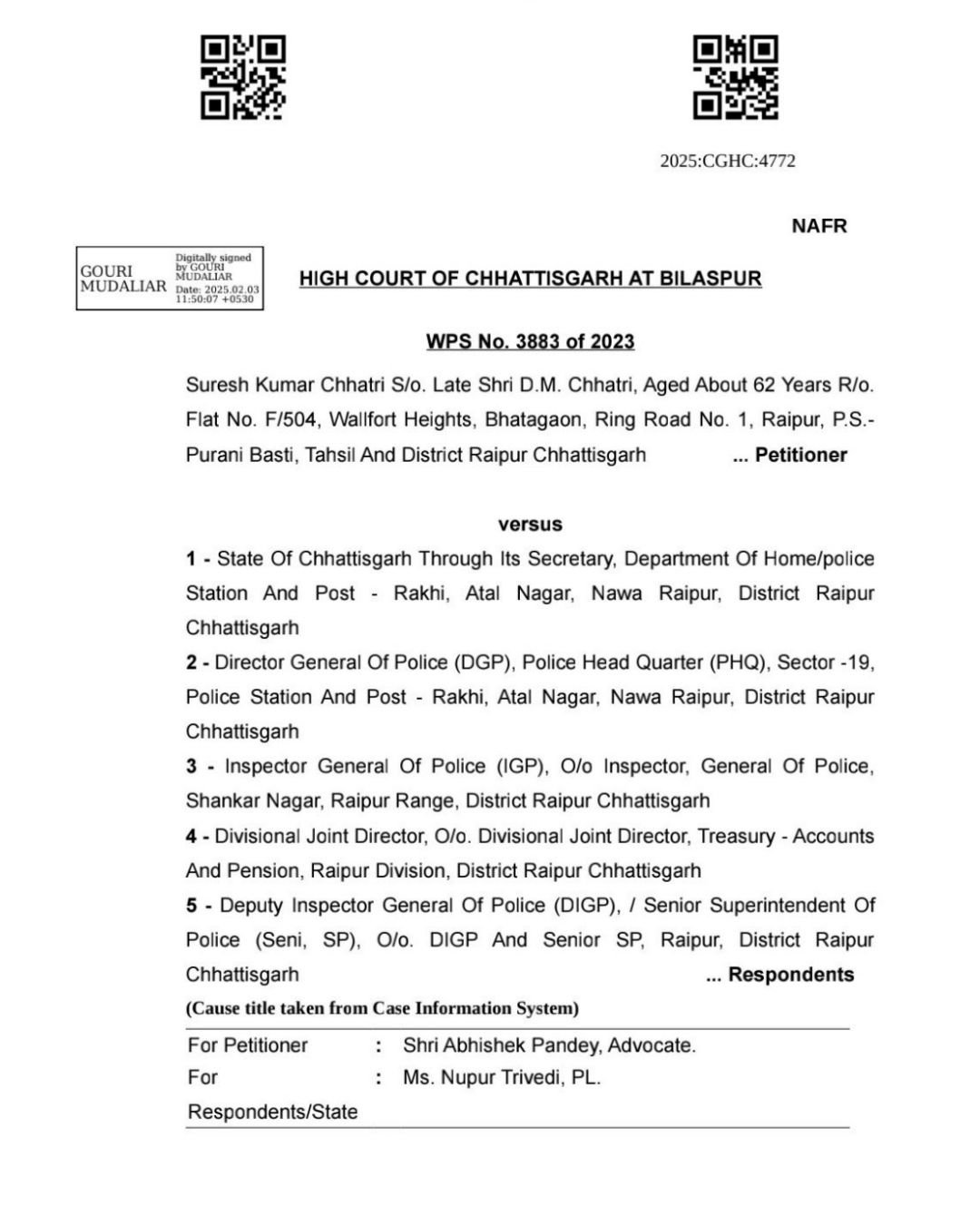 संलग्न (1) उच्च न्यायालय, बिलासपुर द्वारा रिट याचिका W.P.(S) No. 3883/2023 में दिनांक 27.01.2025 को पारित आदेश की प्रति।