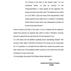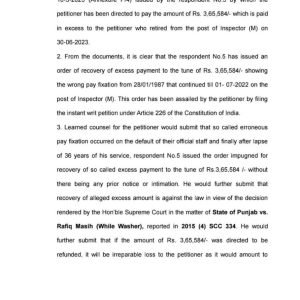 , इस आधार पर शासकीय अधिकारी / कर्मचारी से किसी भी प्रकार की अधिक भुगतान की वसूली नहीं की जा सकती है। उच्च न्यायालय, बिलासपुर द्वारा उक्त रिट याचिका की सुनवाई के पश्चात् रिट याचिका को स्वीकार कर माननीय सुप्रीम कोर्ट द्वारा पूर्व में रफीक मसीह, थॉमस डेनियल के वाद में पारित न्यायदृष्टांतों के आधार पर उक्त रिट याचिका को स्वीकार कर याचिकाकर्ता इन्सपेक्टर (एम.) एस. के, क्षत्री के विरूद्ध जारी वसूली आदेश को निरस्त कर पुलिस अधीक्षक (एसपी), रायपुर को यह निर्देशित किया गया कि वे याचिकाकर्ता से वसूल की गई राशि, इसके साथ ही याचिकाकर्ता के रोके गये समस्त सेवानिवृत्ति देयक का तत्काल भुगतान करें।