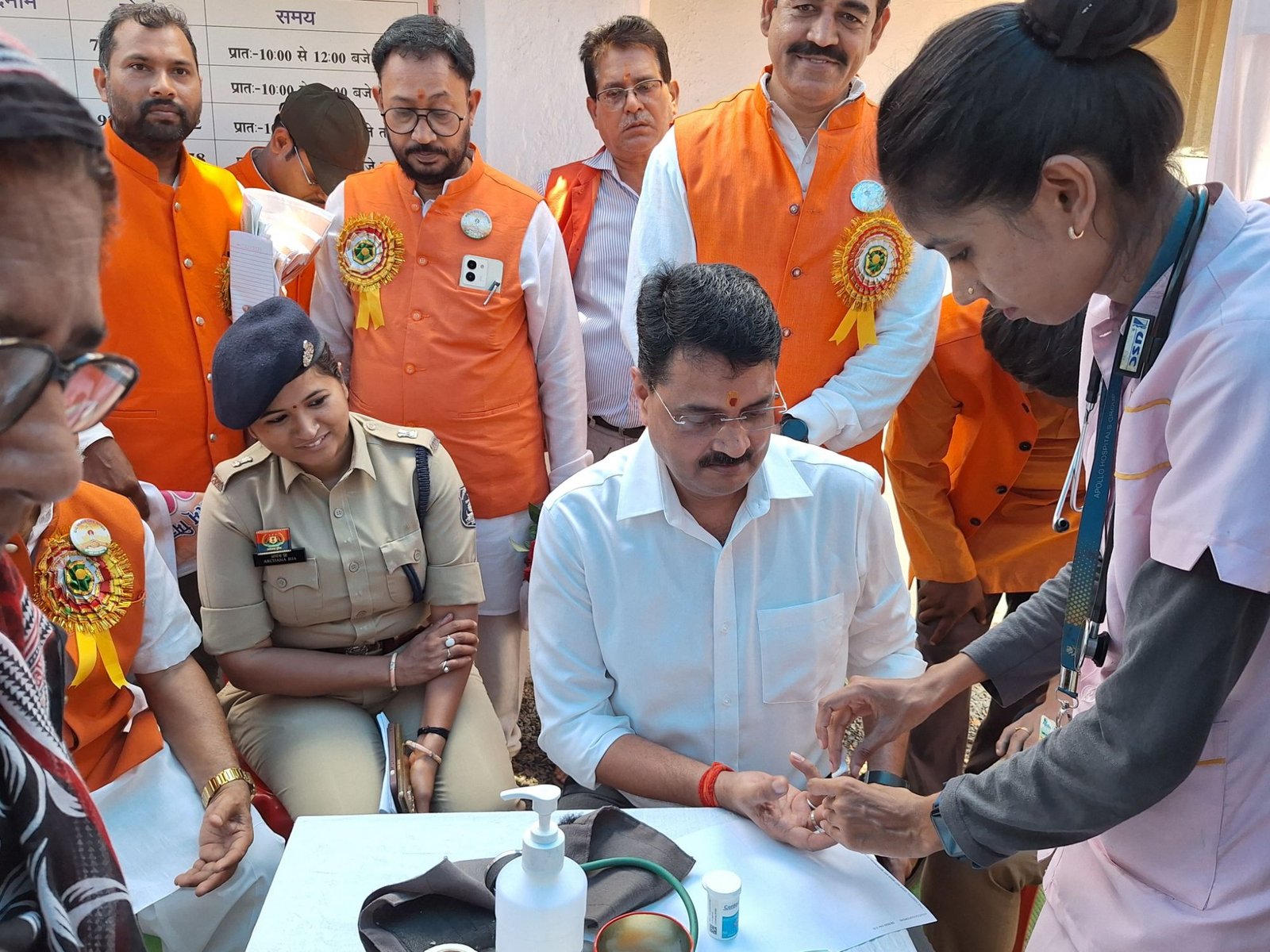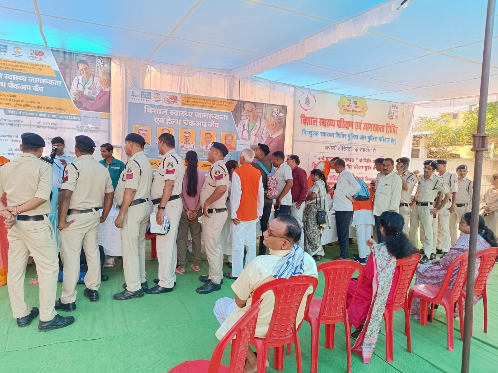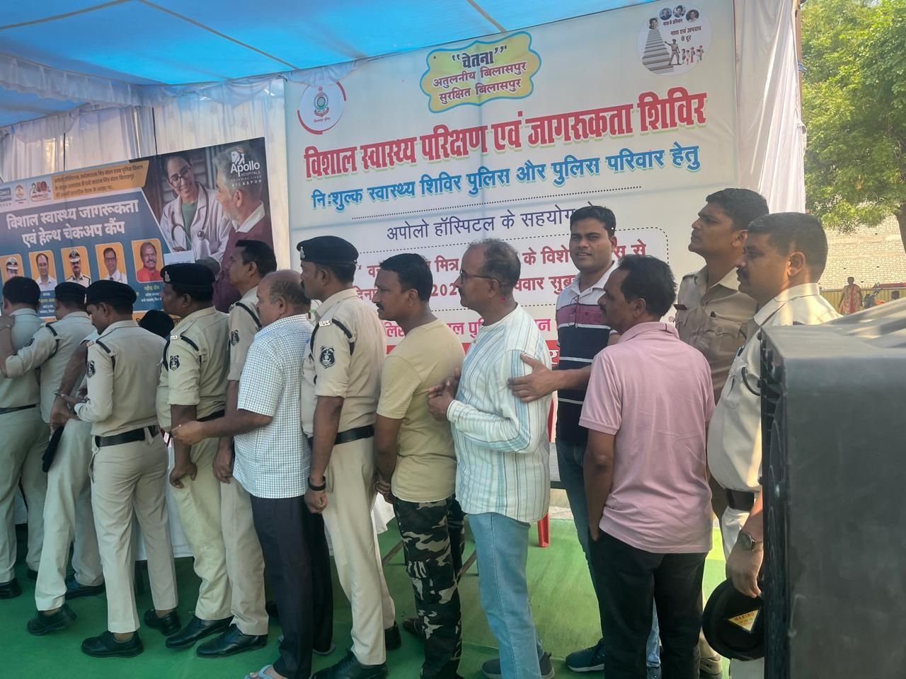 पुलिस लाइन बिलासपुर में आज ‘चेतना’ अभियान के अंतर्गत पुलिस कर्मियों एवं उनके परिवारजनों के लिए एक भव्य निःशुल्क स्वास्थ्य परीक्षण एवं जागरूकता शिविर का आयोजन किया गया। यह आयोजन वंदे मातरम् मित्र मंडल छत्तीसगढ़ प्रांत द्वारा अपनी सेवा यात्रा के 200 सप्ताह पूर्ण होने के उपलक्ष्य में किया गया। इस शिविर में अपोलो हॉस्पिटल्स बिलासपुर ने विशेषज्ञ चिकित्सकों की एक टीम के साथ सक्रिय सहयोग दिया, जबकि आंखों की जांच की सुविधा टाइटन आई प्लस द्वारा प्रदान की गई।