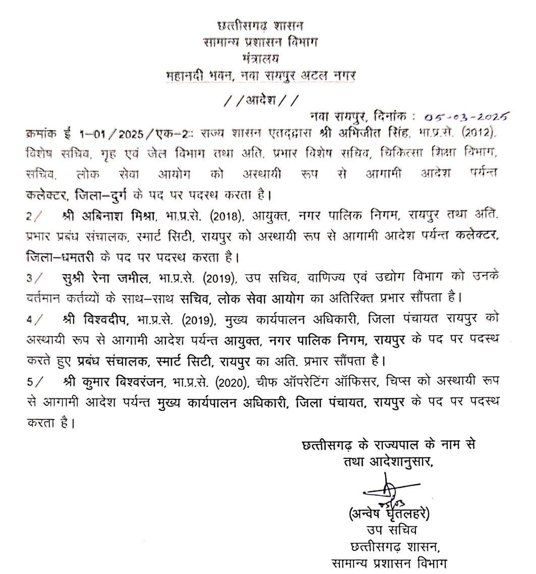 अभिजीत सिंह (IAS 2012) – विशेष सचिव, गृह एवं जेल विभाग से स्थानांतरित होकर कलेक्टर, दुर्ग बने। अभिनाश मिश्रा (IAS 2018) – रायपुर नगर निगम आयुक्त से स्थानांतरित होकर कलेक्टर, धमतरी नियुक्त। सुश्री रेना जमील (IAS 2019) – उप सचिव, वाणिज्य एवं उद्योग विभाग को सचिव, लोक सेवा आयोग का अतिरिक्त प्रभार सौंपा गया।