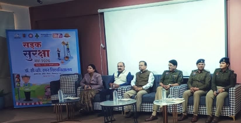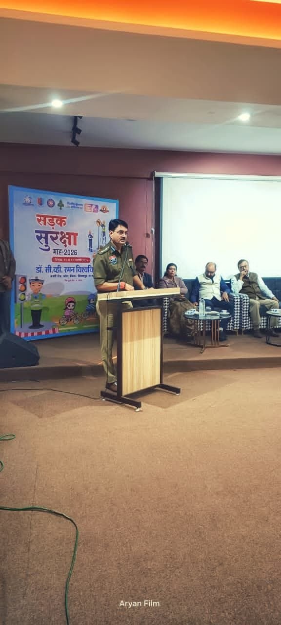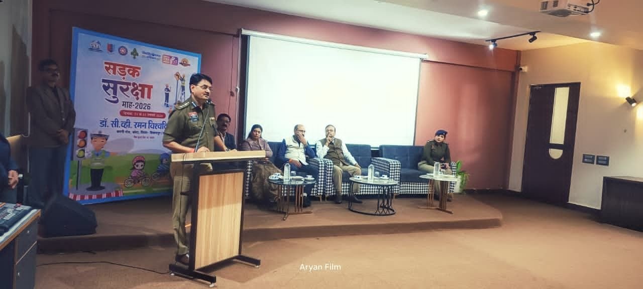 बिलासपुर में पुलिस महानिरीक्षक बिलासपुर रेंज डॉ संजीव शुक्ला एवं वरिष्ठ पुलिस अधीक्षक रजनेश सिंह के मार्गदर्शन एवं निर्देशन में अतिरिक्त पुलिस अधीक्षक रामगोपाल करियारे के पर्यवेक्षण में नियमित रूप से विभिन्न कार्यक्रमों के माध्यम से आम नागरिकों को सड़क सुरक्षा एवं यातायात नियमों के प्रति जागरूकता प्रदान की जा रही है। इसी क्रम में आज रमन विश्वविद्यालय कोटा बिलासपुर में सड़क सुरक्षा माह 2026 के अनुक्रम में सड़क सुरक्षा जागरूकता कार्यक्रम का आयोजन किया गया