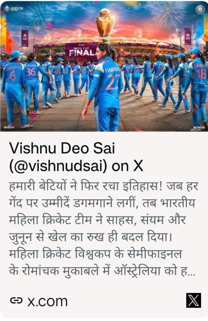 भारत की बेटियों ने रचा नया इतिहास: महिला क्रिकेट टीम विश्वकप के फाइनल में पहुँची..मुख्यमंत्री विष्णु देव साय ने दी बधाई