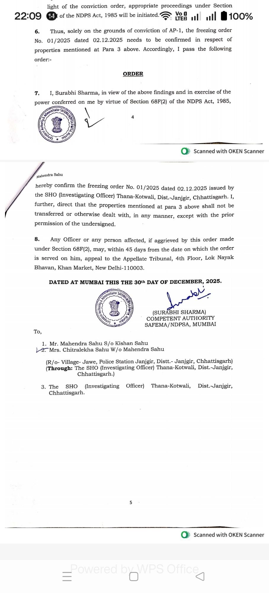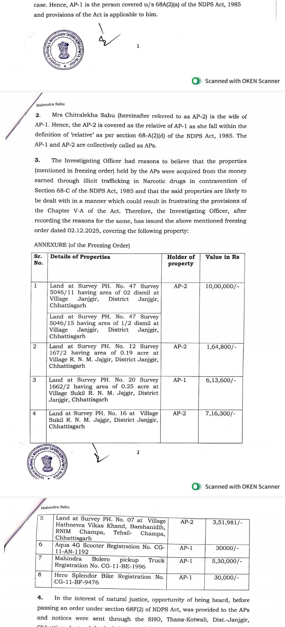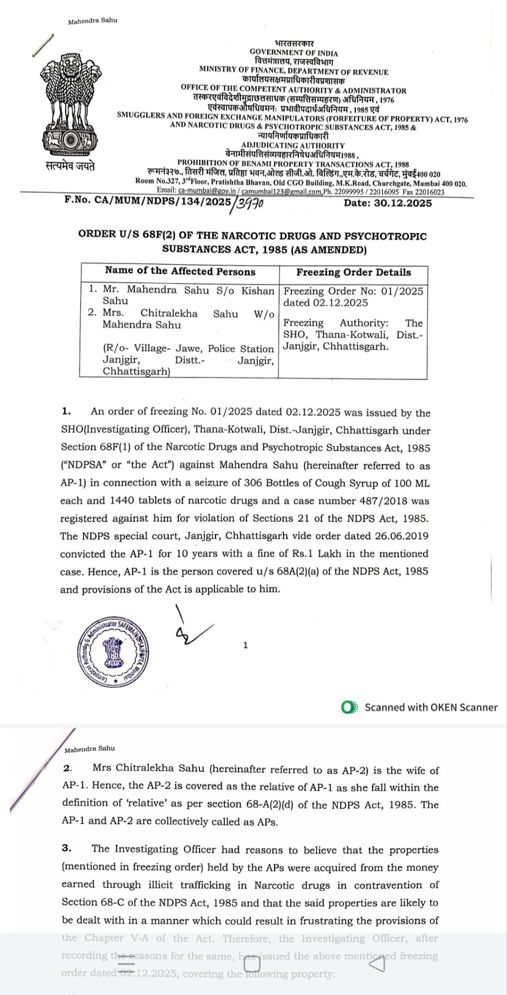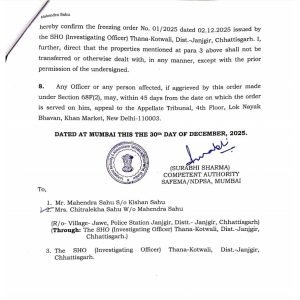 SAFEMA/NDPS कोर्ट मुंबई द्वारा महेंद्र साहू की लगभग 35 लाख की अवैध संपत्तियों को किया गया फ्रीज