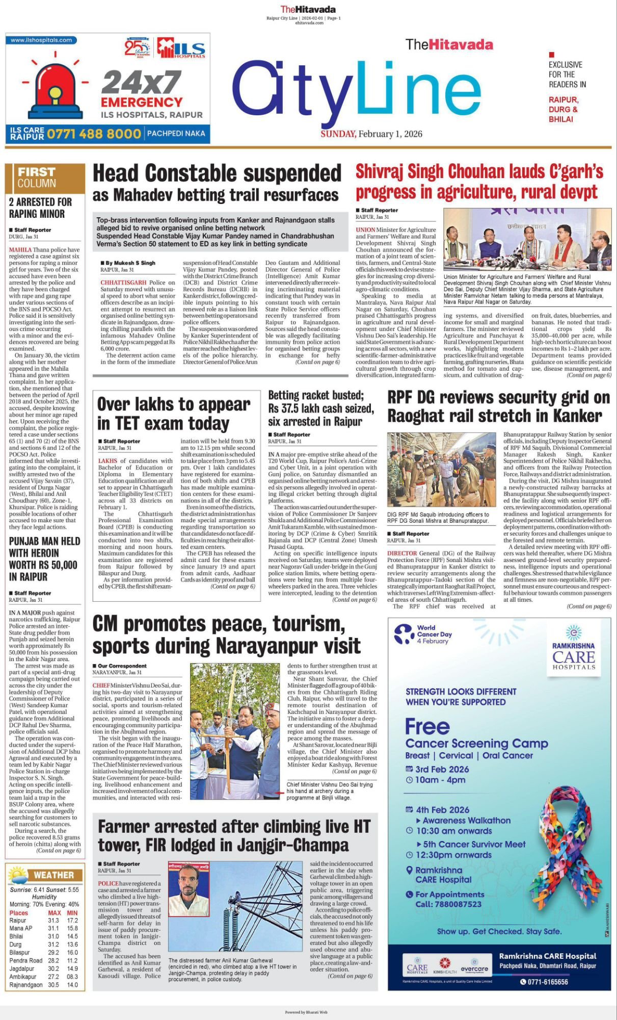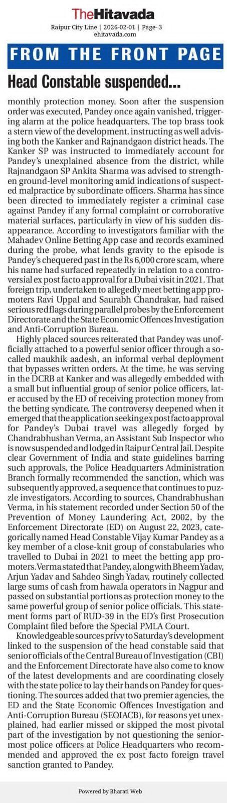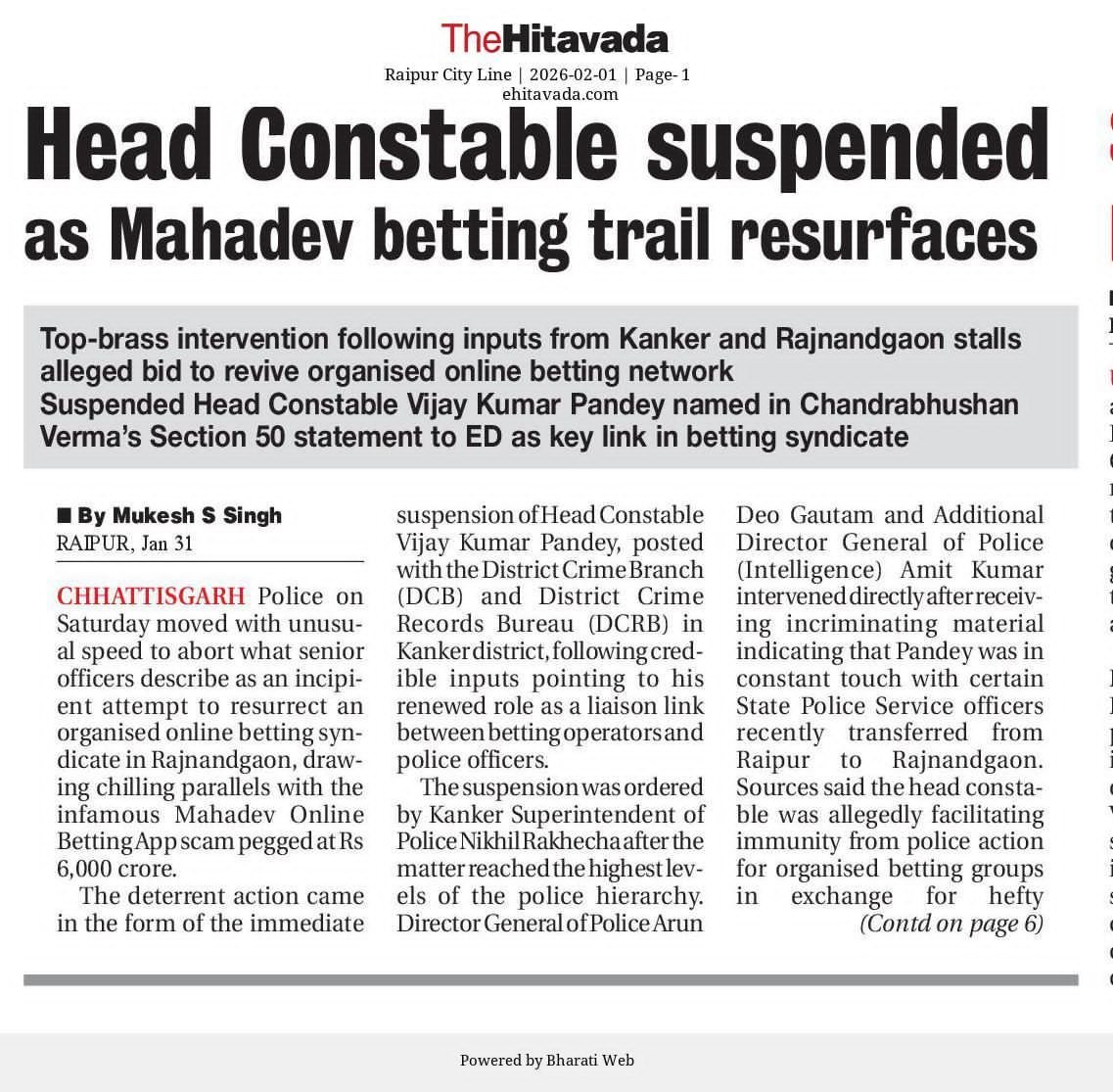 रायपुर, 01 फ़रवरी,2026:- छत्तीसगढ़ में कुख्यात महादेव ऑनलाइन सट्टा ऐप घोटाले की परछाईं एक बार फिर सतह पर आ गई है। शनिवार को पुलिस मुख्यालय ने असाधारण तेजी दिखाते हुए राजनांदगांव जिले में कथित तौर पर उभर रहे एक नए संगठित ऑनलाइन सट्टा सिंडिकेट को शुरुआती चरण में ही रोक दिया। इस कार्रवाई के केंद्र में रहे कांकेर जिले में पदस्थ हेड कॉन्स्टेबल विजय कुमार पांडेय, जिन्हें तत्काल प्रभाव से निलंबित कर दिया गया।