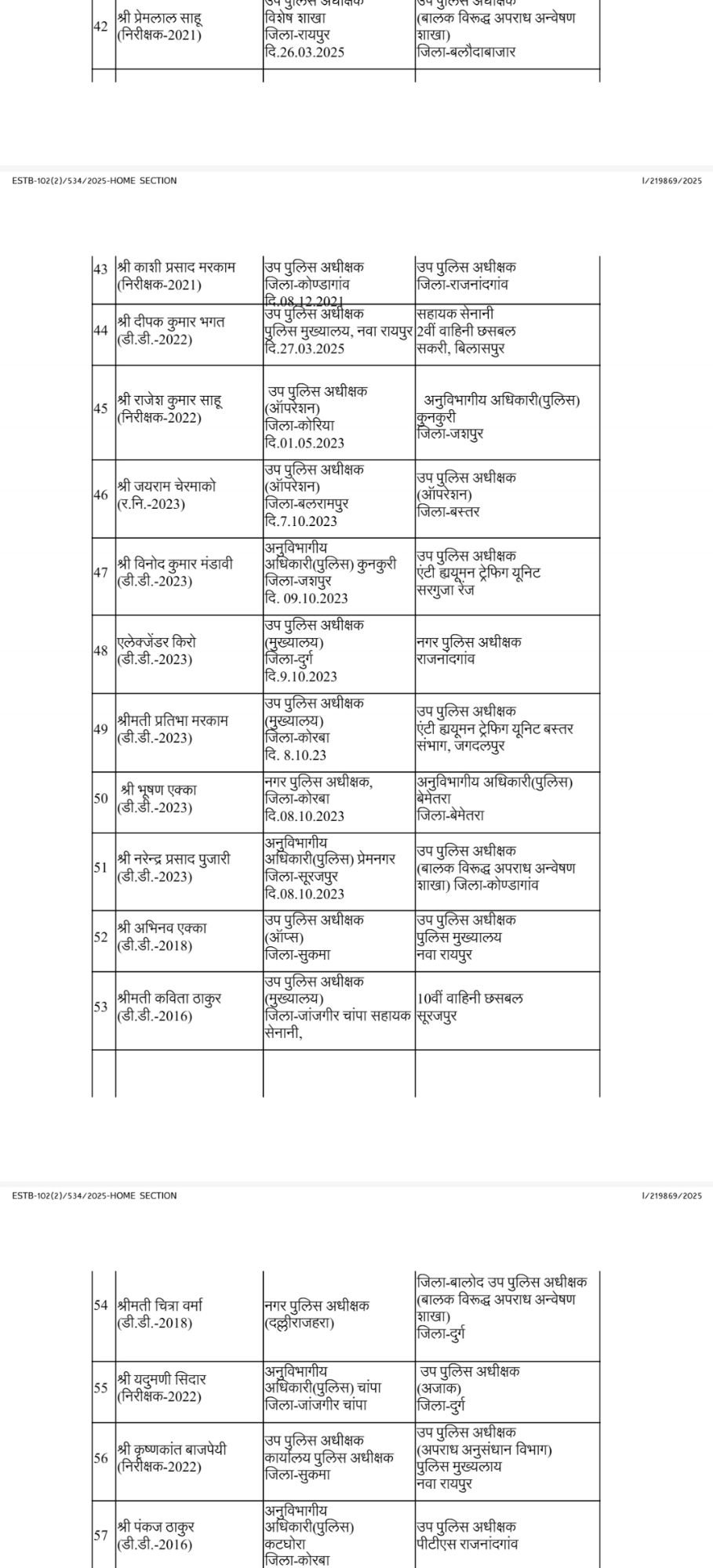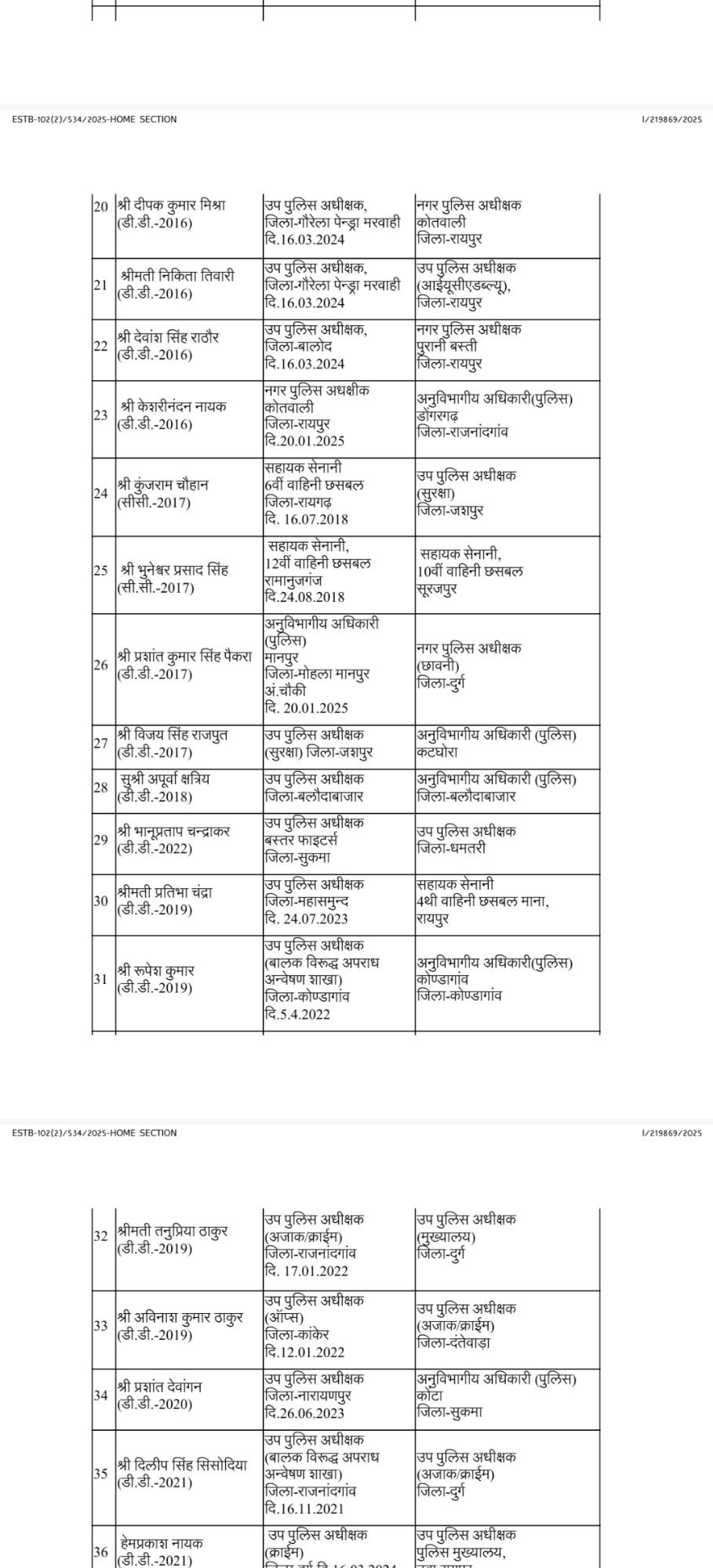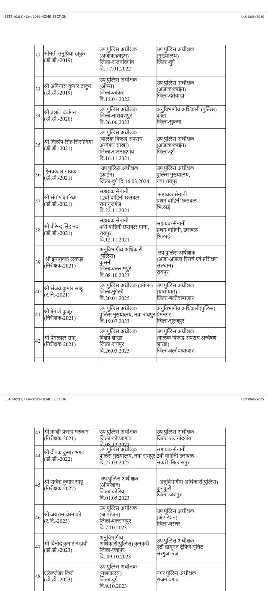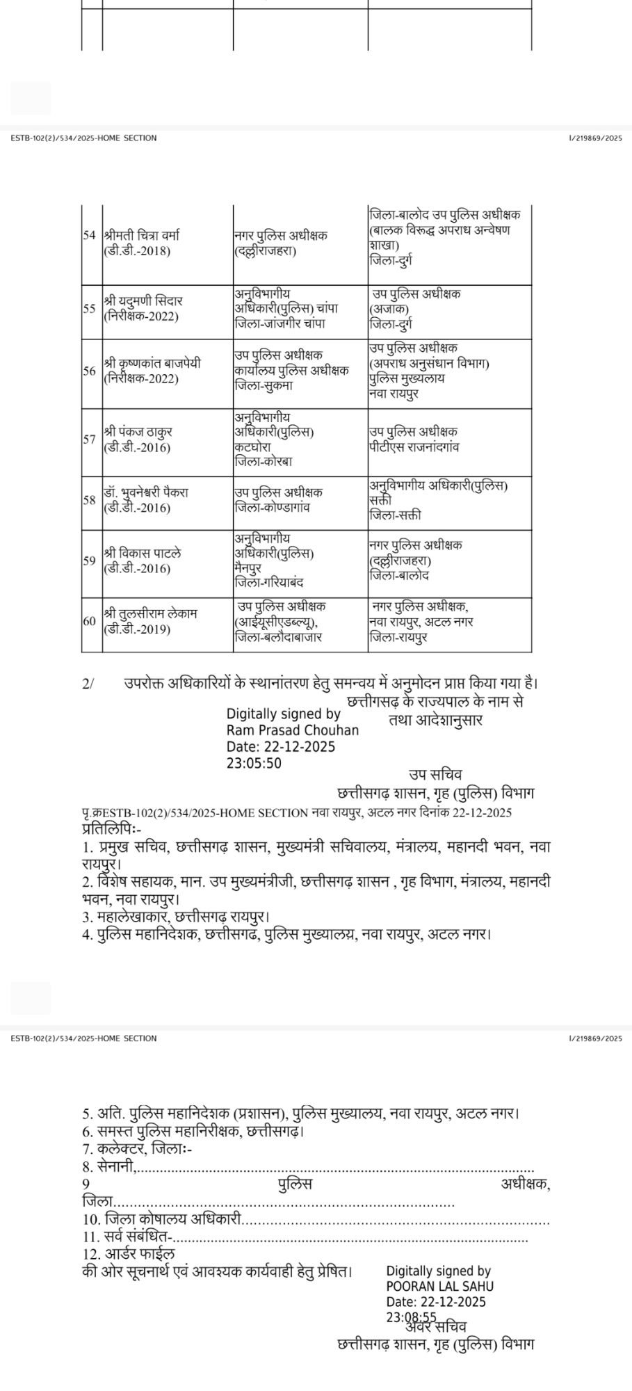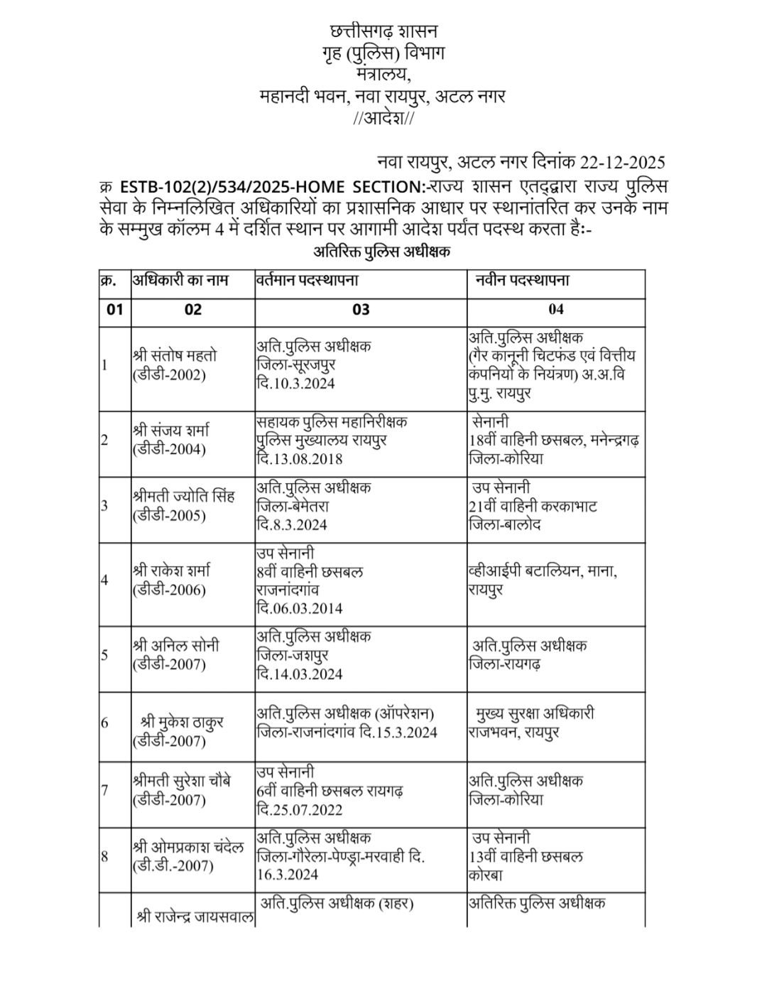 रायपुर 23 दिसंबर 2025:- छत्तीसगढ़ शासन ने पुलिस विभाग में बड़ा प्रशासनिक फेरबदल करते हुए व्यापक तबादला आदेश जारी किया है। इस आदेश के तहत प्रदेशभर में 35 एडिशनल एसपी और 60 डीएसपी के स्थानांतरण किए गए हैं। इसी क्रम में मणि शंकर चन्द्रा अतिरिक्त पुलिस अधीक्षक दुर्ग ग्रामीण होंगे अभिषेक झा अतिरिक्त पुलिस अधीक्षक दुर्ग ग्रामीण का तबादला अतिरिक्त पुलिस अधीक्षक विशेष आसूचना शाखा कैंप बस्तर, तबादला किया गया है, अभिषेक महेश्वरी उप सेनानी छत्तीसगढ़ सशस्त्र बल 16वीं वाहिनी नारायणपुर, पद्मश्री तंवर अतिरिक्त पुलिस अधीक्षक ICUAW से जोनल पुलिस अधीक्षक विशेष शाखा भिलाई, सुरेश चौबे अतिरिक्त पुलिस अधीक्षक कोरिया, दिलीप कुमार सिसोदिया डीएसपी क्राइम भिलाई, एलेक्जेंड्रर किरो नगर पुलिस अधीक्षक राजनंदगांव,भूषण इक्का एसडीओपी बेमेतरा, प्रशांत सिंह पैकरा सीएसपी छावनी, हेम प्रकाश नायक डीएसपी पुलिस मुख्यालय रायपुर, तनु प्रिया ठाकुर डीएसपी मुख्यालय दुर्ग,यदुमणि सिदार डीसीपी अजाक दुर्ग, तबादला किया गया है।