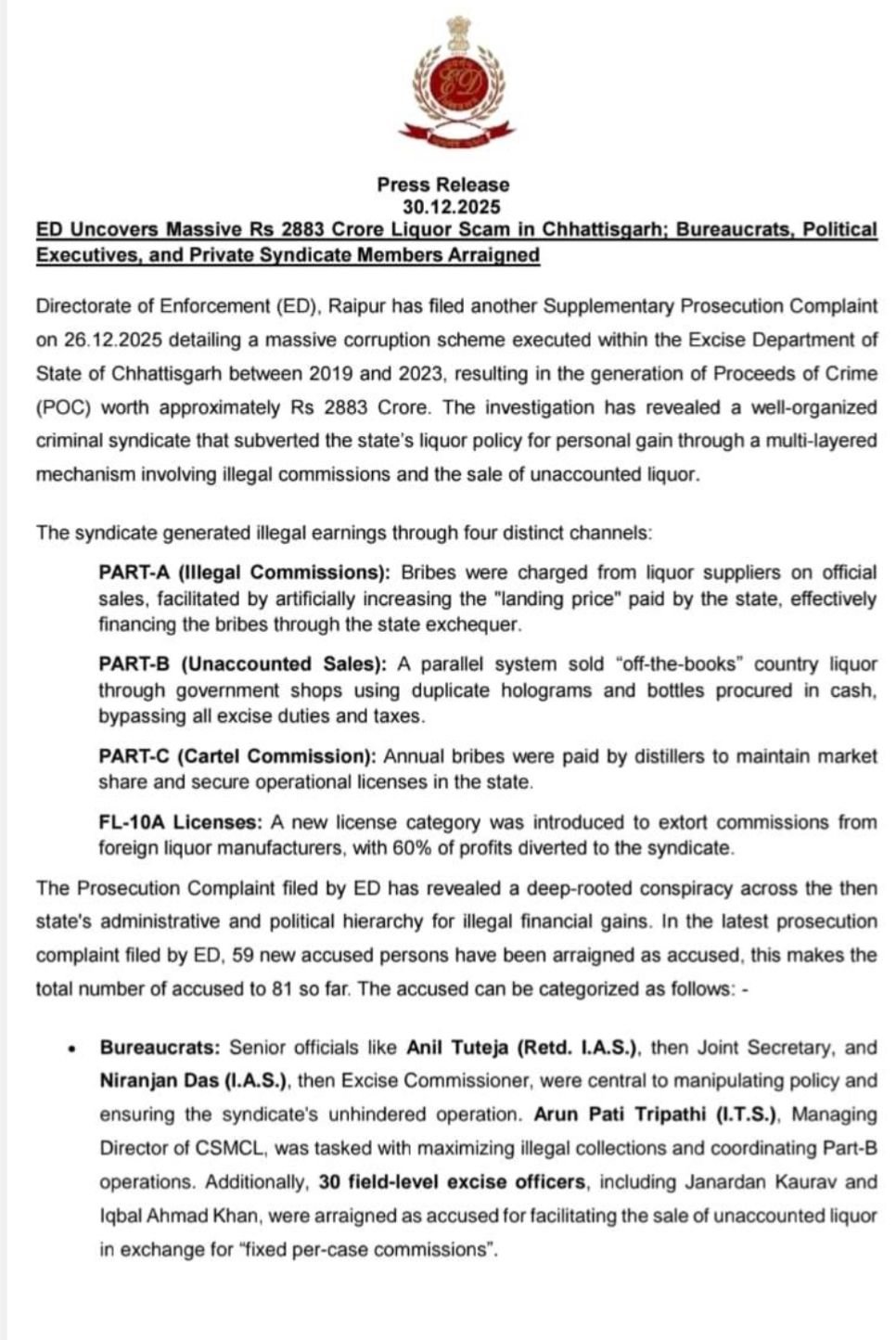रायपुर, 31 दिसंबर 2025:-छत्तीसगढ़ शराब घोटाले मामले में प्रवर्तन निदेशालय (ED) ने एक और सप्लीमेंट्री चार्जशीट दाखिल की है, जिसके मुताबिक छत्तीसगढ़ में शराब कारोबार से जुड़ा अब तक का सबसे बड़ा घोटाला सामने आया है. ED ने आरोप लगाया कि साल 2019 से 2023 के बीच राज्य के आबकारी विभाग में सुनियोजित भ्रष्टाचार के जरिए करीब 2,883 करोड़ रुपये की अवैध कमाई की गई.