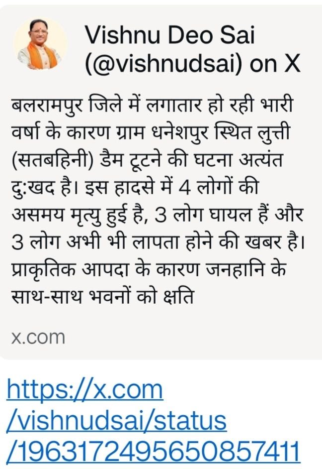 रायपुर, 03 सितंबर 2025:- मुख्यमंत्री विष्णु देव साय ने बलरामपुर जिले के ग्राम धनेशपुर स्थित लुत्ती (सतबहिनी) डैम टूटने की घटना पर गहरा शोक व्यक्त किया है। इस हादसे में 4 लोगों की मृत्यु, 3 लोगों के घायल होने तथा 3 लोगों के लापता होने की सूचना है। मुख्यमंत्री ने कहा कि यह अत्यंत दुखद और पीड़ादायी घटना है। ईश्वर से दिवंगत आत्माओं की शांति और घायलों के शीघ्र स्वास्थ्य लाभ की प्रार्थना करता हूँ।