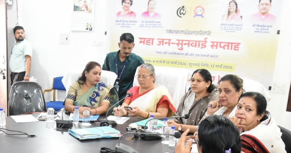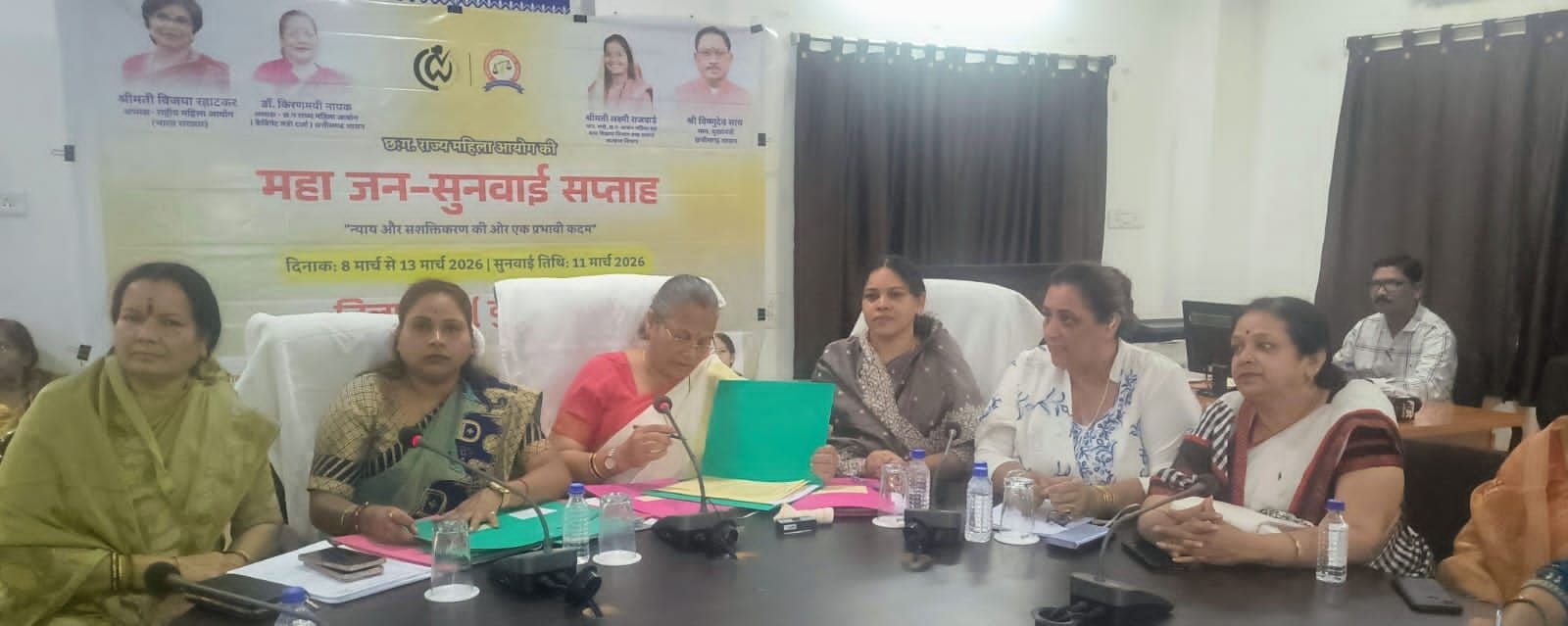दुर्ग, 11 मार्च 2026:- छत्तीसगढ़ राज्य महिला आयोग की अध्यक्ष डॉ. किरणमयी नायक एवं प्रभारी सदस्य श्रीमती ओजस्वी मंडावी, सदस्य श्रीमती दीपिका सोरी, सदस्य सरला कोसरिया द्वारा राज्य की महिलाओं को त्वरित राहत पहुँचाने के उद्देश्य से एक वृहद और संवेदनशील निर्णय लिया गया है। अंतर्राष्ट्रीय महिला दिवस के अवसर पर आयोग द्वारा आगामी 11 मार्च 2026 को दुर्ग संभाग के लिए महाजन-सुनवाई सप्ताह का आयोजन प्रेरणा सभा कक्ष, बालगृह परिसर पांच बिल्डिंग महिला एवं बाल विकास कार्यालय दुर्ग में किया जा रहा है।