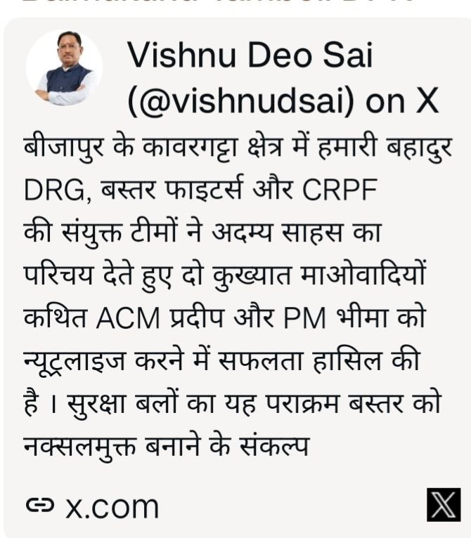 मुख्यमंत्री श्री विष्णु देव साय ने कहा कि हमारी बहादुर डीआरजी, बस्तर फाइटर्स एवं सीआरपीएफ की संयुक्त टीमों ने अदम्य साहस और उत्कृष्ट रणनीति का परिचय देते हुए दो कुख्यात माओवादियों — कथित एरिया कमांडर प्रदीप (ACM) एवं पार्टी मेंबर भीमा (PM) — को न्यूट्रलाइज करने में सफलता हासिल की है।