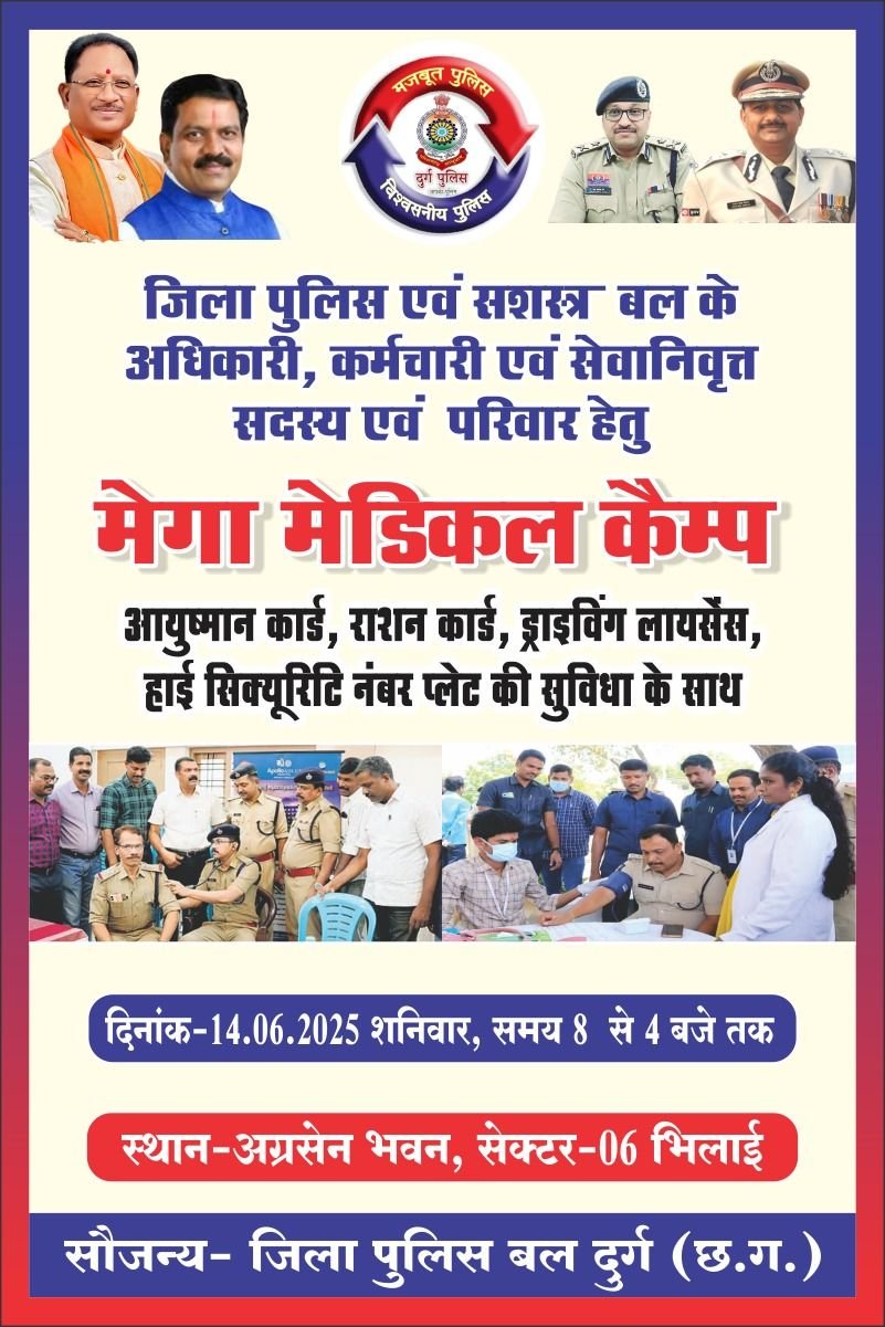 भिलाई नगर 13 जून 2025:- शनिवार 14 जून को  जिला पुलिस बल दुर्ग द्वारा पुलिस बल, सशस्त्र पुलिस बल एवं पुलिस परिवारों के सदस्यों के लिए मेगा मेडिकल कैम्प का आयोजन अग्रसेन भवन, सेक्टर-6 भिलाई नगर में प्रातः 08.00 बजे से संध्या 04.00 बजे तक किया जा रहा है।