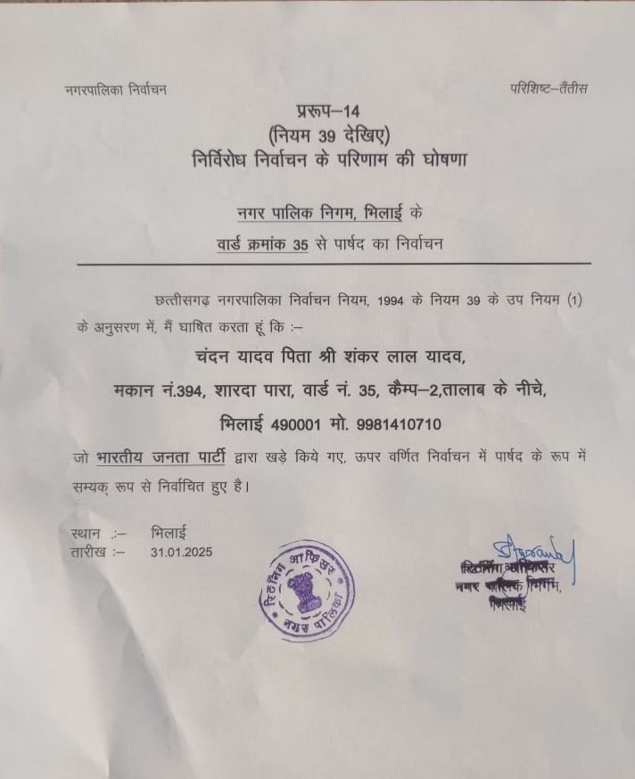 वार्ड 35 उपचुनाव में भाजपा प्रत्याशी चंदन यादव निर्विरोध निर्वाचित घोषित कर दिए गए उनके प्रतिद्वंद्वी कांग्रेस प्रत्याशी मनोज सिन्हा ने नाम वापसी के कुछ समय पहले अपना नामांकन वापस लेकर भिलाई विधायक रिकेश सेन के समक्ष भाजपा में प्रवेश कर लिया।