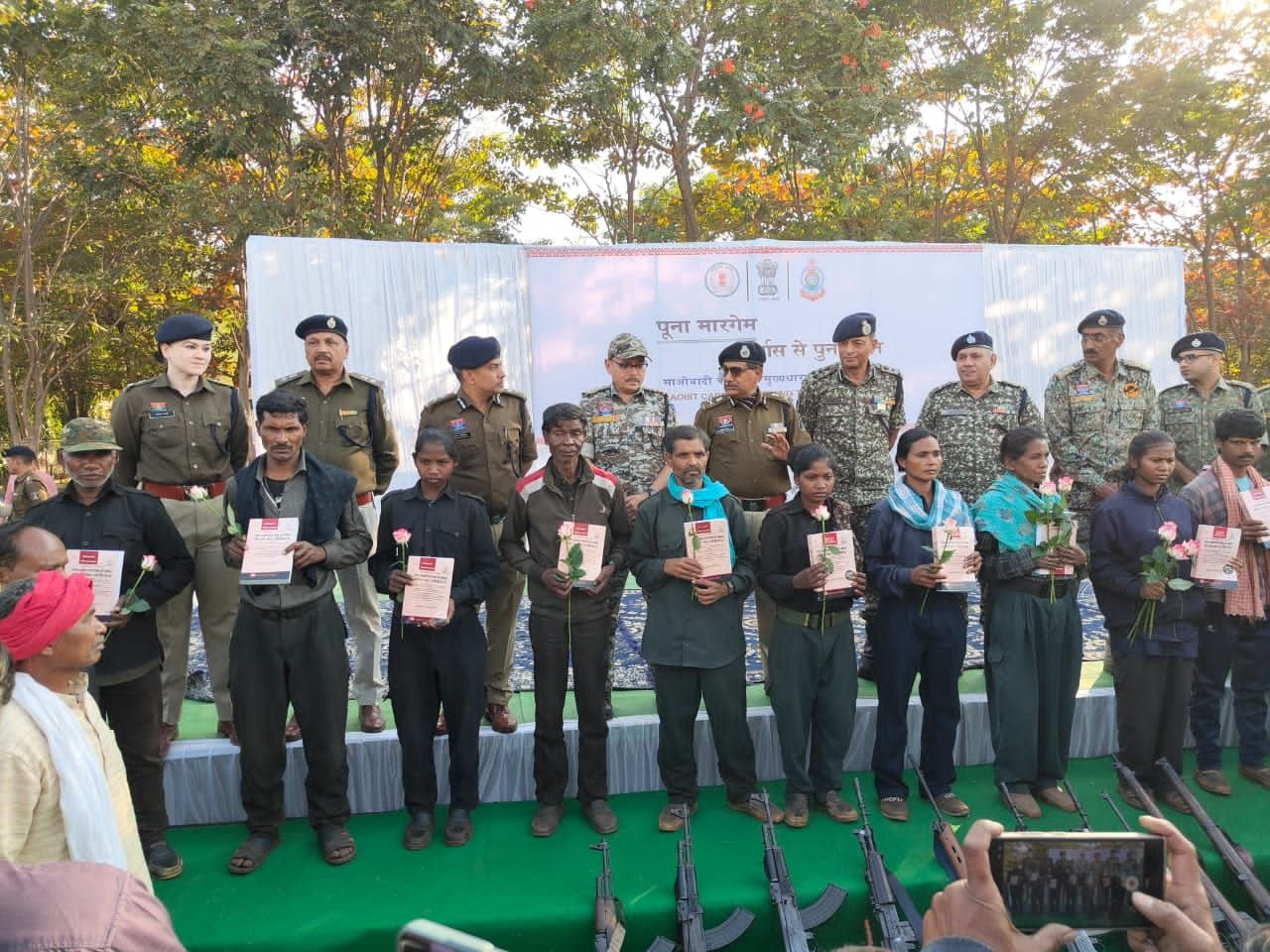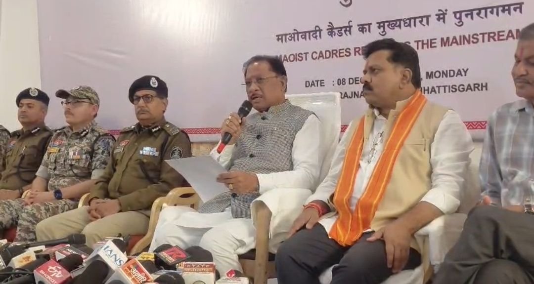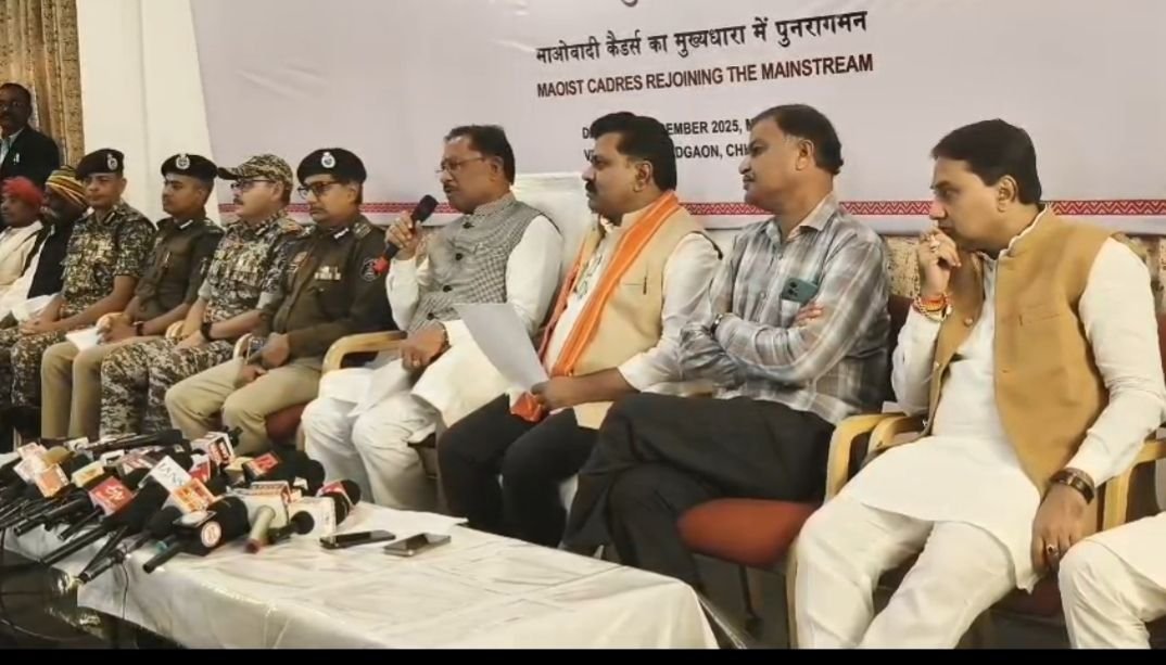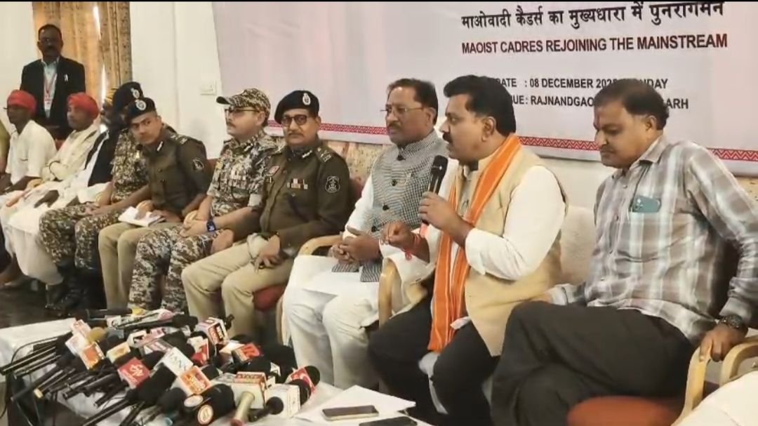 राजनांदगांव 09 दिसंबर 2025 :- शासन की ‘‘आत्मसमर्पण एवं पुनर्वास नीति’’ से प्रभावित होकर किया आत्मसमर्पण।राजनांदगांव रेंज में नक्सल उन्मूलन की दिशा में एक ऐतिहासिक सफलता प्राप्त हुई है। समाज के प्रमुख व्यक्तियों, पुलिस महानिदेशक, छत्तीसगढ़ अरूण देव गौतम , अतिरिक्त पुलिस महानिदेशक, नक्सल ऑपरेशन विवेकानंद पुलिस महानिरीक्षक राजनांदगांव रेंज अभिषेक शांडिल्य, उप महानिरीक्षक (नक्सल आपरेशन) आईटीबीपी अनवर ईलाही एवं रेंज के सभी पुलिस अधीक्षकों की उपस्थिति में एमएमसी जोन अंतर्गत सक्रिय प्रतिबंधित संगठन ब्च्प् ;डंवपेजद्ध के ब्ब्ड सदस्य रामधेर उर्फ होरूपु उर्फ अमरजीत उर्फ देउ मज्जी सहित 12 शस्त्रधारी माओवादी हथियार सहित आज पुनर्वास हेतु समाज के मुख्यधारा से जुड़ रहे हैं। शासन की आत्मसमर्पण एवं पुनर्वास नीति से प्रभावित होकर तथा नक्सलियों के खोखली विचारधारा, उनके शोषण, अत्याचार, हिंसा से तंग आकर सी.पी.आई. माओवादी संगठन एमएमसी जोन के शीर्ष माओवादियों ने पुनर्वास हेतु अपने साथियों के साथ समाज के मुख्य धारा में जुडे़।