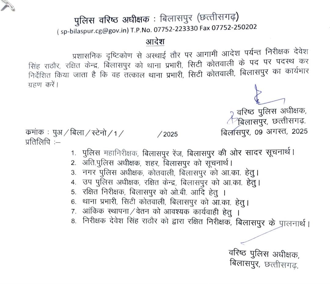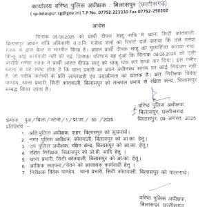 5/8/25 को मृतक दीपक साहू रात्रि में थाना सिटी कोतवाली आकर रिपोर्ट दर्ज कराया रात्रि अधिकारी सहायक उपनिरीक्षक गजेंद्र शर्मा द्वारा रिपोर्ट दर्ज कर mlc कराया गया लेकिन उसपर किसी प्रकार की कार्यवाही नही किया गया। जिसके परिणाम स्वरूप 8/8/25 को अनावेदक द्वारा रिपोर्ट करता दीपक साहू की हत्या कर दिया गया जोकि सहायक उपनिरीक्षक गजेंद्र शर्मा द्वारा अपने कर्तव्य के प्रति घोर अनुशासनहीनता का परिचय देने के कारण उन्हें तत्काल प्रभाव से निलंबित कर रक्षित केंद्र अटैच किया गया तथा थाना प्रभारी निरीक्षक श्री विवेक पाण्डेय को अपने अधीनस्थ स्टाफ पर नियंत्रण न रख पाने के करण लाइन अटैच कर दिया गया है। वरिष्ठ पुलिस अधीक्षक बिलासपुर ने स्पष्ट संदेश दिया है कि कोई भी अधिकारी/कर्मचारी अगर अपने पदीय कर्तव्यों के प्रति उदासीनता करता है तो तत्काल उसके विरुद्ध अनुशासनात्मक कार्यवाही की जाएगी।