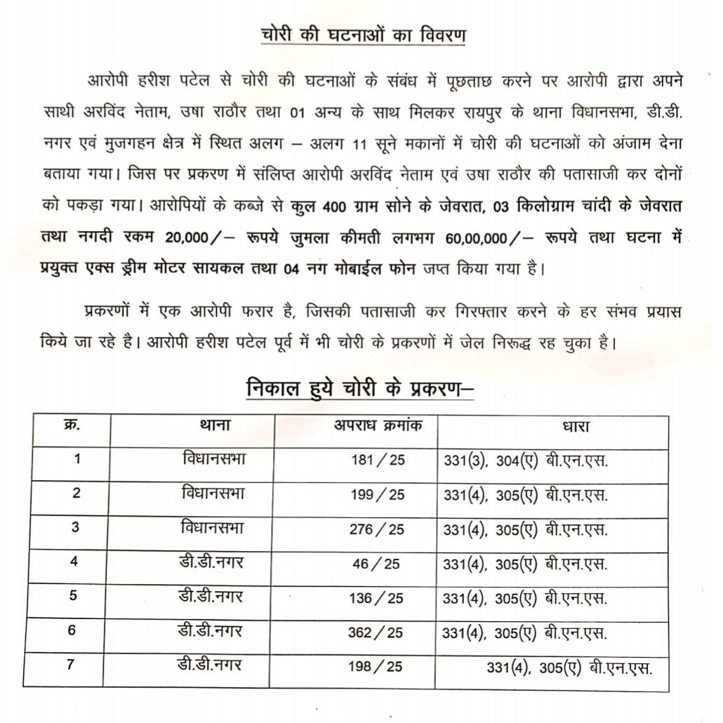 पुलिस की पूछताछ में पता चला कि आरोपी हरीश पटेल शातिर चोर है। उसने बताया कि वो अपने साथी अरविंद नेताम, उषा राठौर चरोदा और एक अन्य युवक के साथ मिलकर रायपुर के अलग-अलग इलाकों में 11 सूने मकानों में चोरी कर चुके हैं।
