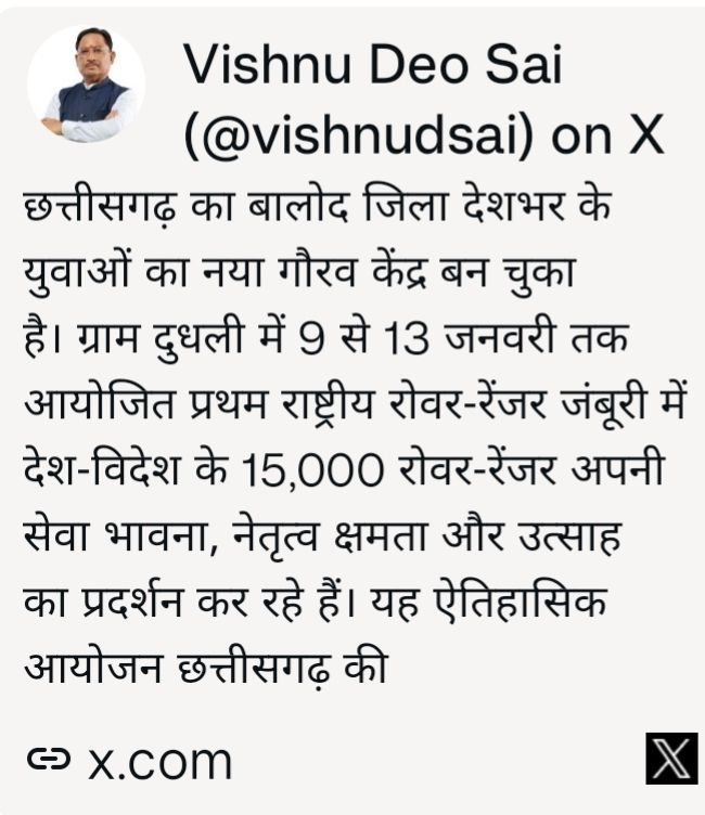 मुख्यमंत्री विष्णुदेव साय ने कहा कि जिला बालोद के ग्राम दुधली में 9 से 13 जनवरी तक आयोजित प्रथम राष्ट्रीय रोवर-रेंजर जंबूरी में देश-विदेश से आए लगभग 15 हजार रोवर-रेंजर अपनी सेवा भावना, नेतृत्व क्षमता और राष्ट्र के प्रति समर्पण का जीवंत प्रदर्शन कर रहे हैं। मुख्यमंत्री श्री विष्णुदेव साय ने कहा कि यह ऐतिहासिक जंबूरी छत्तीसगढ़ की युवा शक्ति को राष्ट्रीय मंच पर लाने का सुनहरा अवसर है। राष्ट्रीय स्तर के कैंपिंग, रोवर-रेंजर प्रशिक्षण, सांस्कृतिक संध्याओं और सामुदायिक सेवा गतिविधियों के माध्यम से युवा प्रतिभागी अनुशासन, सेवा और नेतृत्व के मूल्यों के साथ राष्ट्र निर्माण की भावना को सशक्त कर रहे हैं।