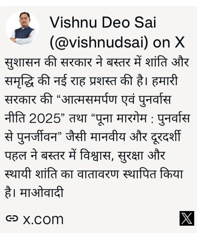 मुख्यमंत्री ने इसे राज्य की प्रभावी रणनीति, पुलिस प्रशासन की सतत मेहनत और जनविश्वास का सामूहिक परिणाम बताते हुए बस्तर में स्थायी शांति स्थापना की दिशा में इसे एक महत्वपूर्ण उपलब्धि कहा।