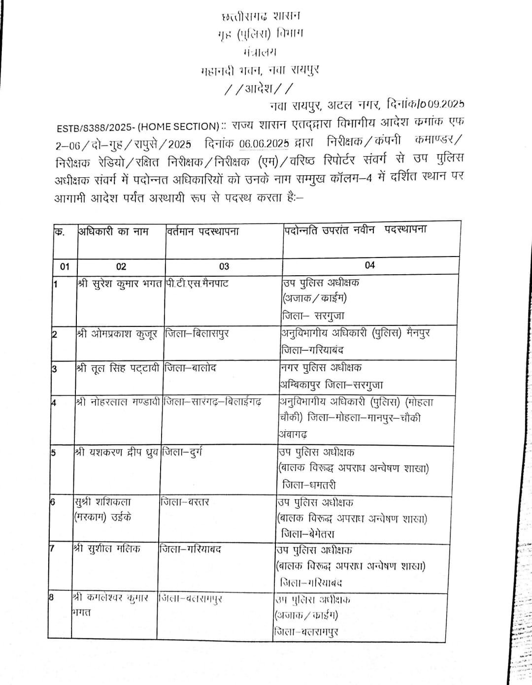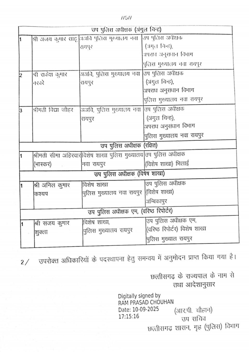 रायपुर 11 सितंबर 2025:- छत्तीसगढ़ सरकार ने नये डीएसपी की पोस्टिंग लिस्ट आज जारी की है। सूची में निरीक्षक, कंपनी कमांण्डर निरीक्षक रेडियो, रक्षित निरीक्षक, निरीक्षक वरिष्ठ रिपोर्टर संवर्ग से उप पुलिस अधीक्षक संवर्ग में पदोन्नत अधिकारियों के नाम शामिल है।