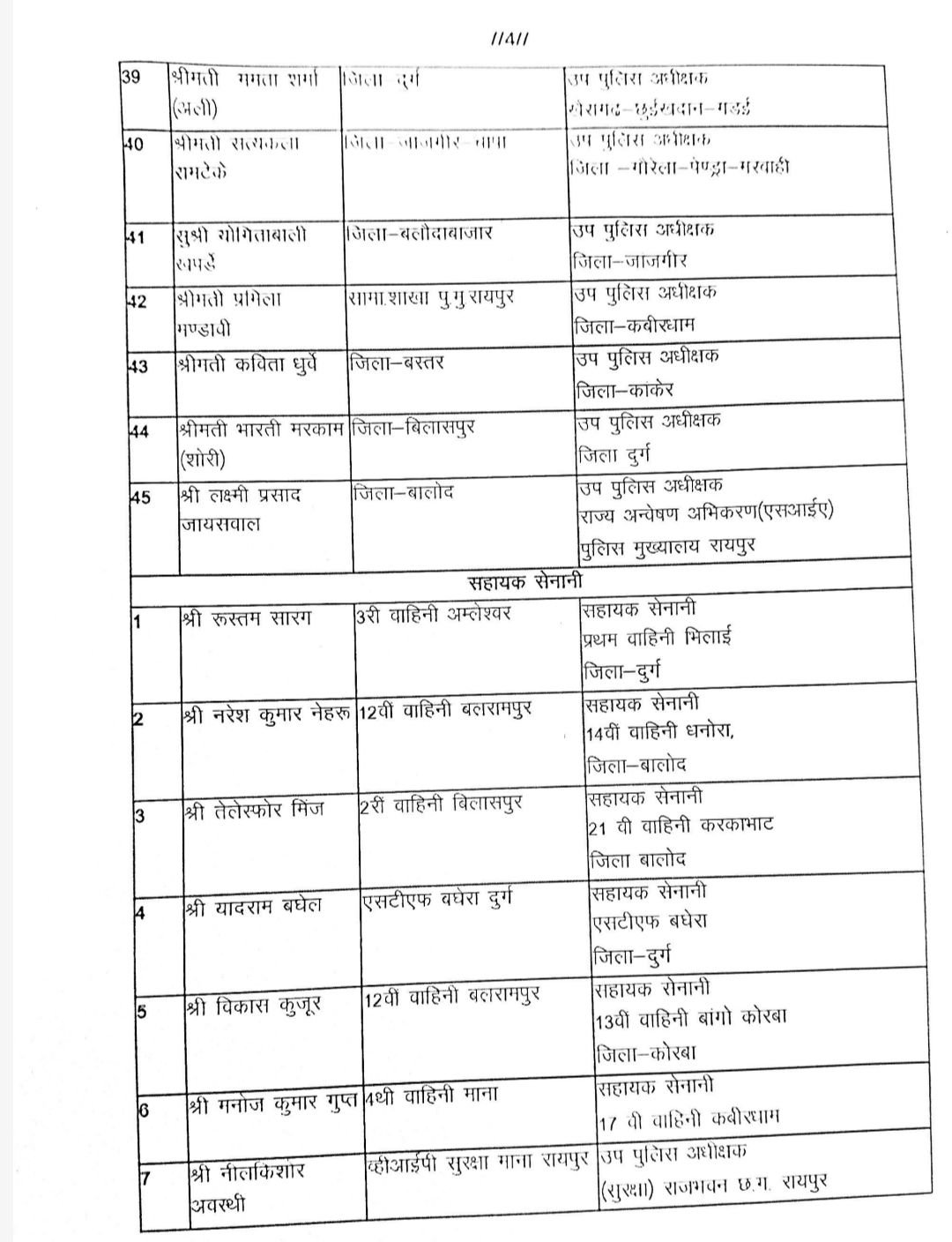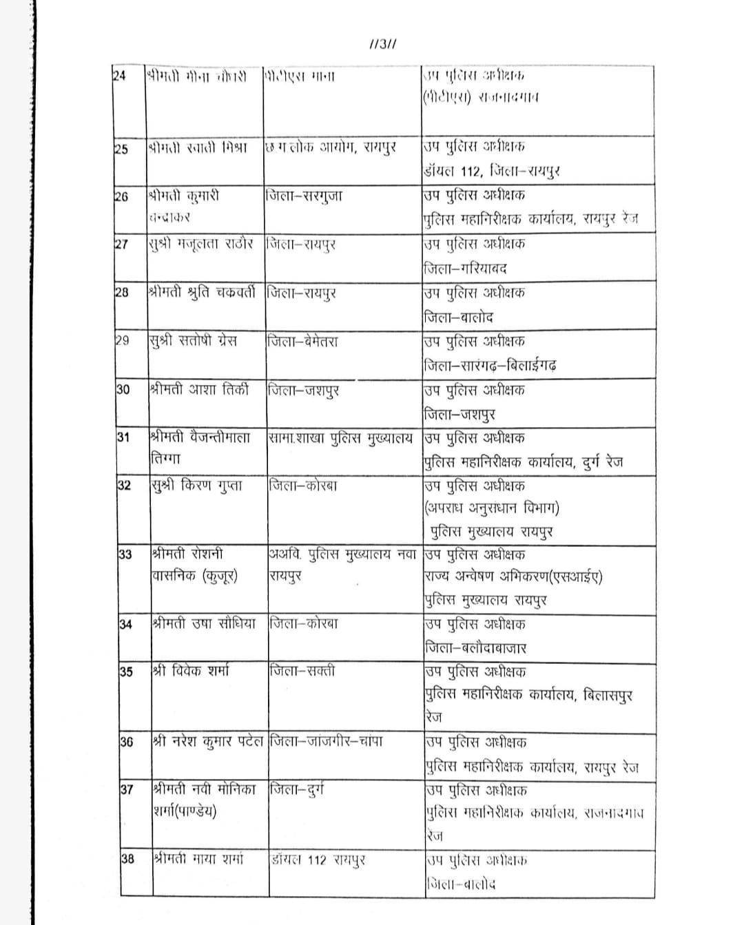 वैजन्तीमाला तिग्गा सामा. शाखा पुलिस मुख्यालय से उप पुलिस अधीक्षक पुलिस महानिरीक्षक कार्यालय दुर्ग रेंज ।
