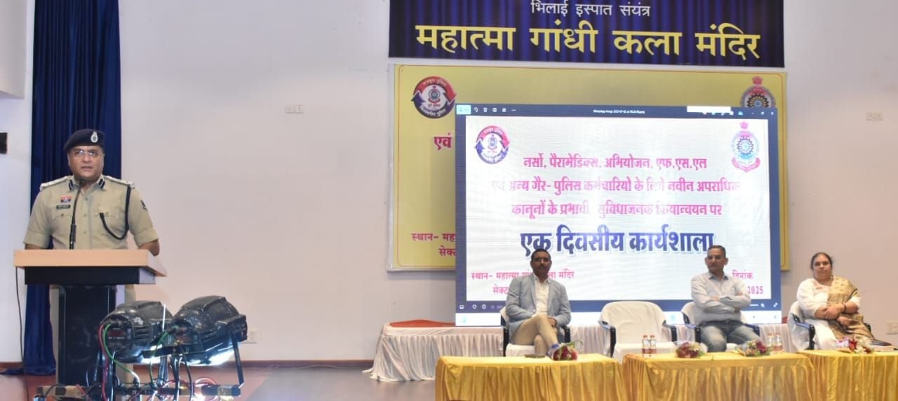 भिलाई नगर 05 जून 2025:- आज 05.07.2025 को नवीन अपराधिक कानूनों पर आधारित संवेदीकरण के अन्तर्गत नर्सो एवं पैरामेडिक्स कर्मचारियों के लिए कार्यशाला का आयोजन महात्मा गाधी, कला मंदिर, सिविक सेंटर, सेक्टर-6 भिलाई में किया गया। उक्त कार्यशाला में वरिष्ठ पुलिस अधीक्षक विजय अग्रवाल, पंकज ताम्रकार, वरिष्ठ वैज्ञानिक अधिकारी एफ.एस.एल.भिलाई, अनुरेखा सिंह, जिला अभियोजन अधिकारी जिला दुर्ग एवं अशोक जोशी, अतिरिक्त पुलिस अधीक्षक (सेवानिवृत )उपस्थित थे।