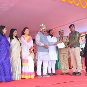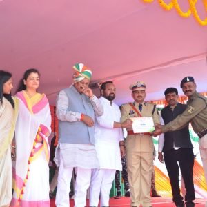 बेमेतरा, 27 जनवरी 2026 :- 26 जनवरी को 77 वें गणतंत्र दिवस के अवसर पर जिला मुख्यालय बेमेतरा के ऐतिहासिक बेसिक स्कूल परेड ग्राउंड में जिला स्तरीय मुख्य समारोह में मुख्य अतिथि दुर्ग लोकसभा सांसद विजय बघेल के द्वारा बेमेतरा विधायक दीपेश साहू एवं जिले के कलेक्टर सुश्री प्रतिष्ठा ममगाई, पुलिस उप महानिरीक्षक (DIG) एवं वरिष्ठ पुलिस अधीक्षक रामकृष्ण साहू, मुख्य कार्यपालन अधिकारी जिला पंचायत सुश्री प्रेमलता पदमाकर, जिला पंचायत अध्यक्ष श्रीमती कल्पना योगेश तिवारी, बेमेतरा नगर पालिका अध्यक्ष विजय सिन्हा व अन्य जनप्रतिनिधि तथा जिले के गणमान्य नागरिकों, स्कूली बच्चों, शिक्षक/शिक्षिकाओं, मीडिया बंधुओं की उपस्थिति में उत्कृष्ट कार्य करने वाले बेमेतरा पुलिस के अधिकारी/कर्मचारियों को सम्मानित किया गया।