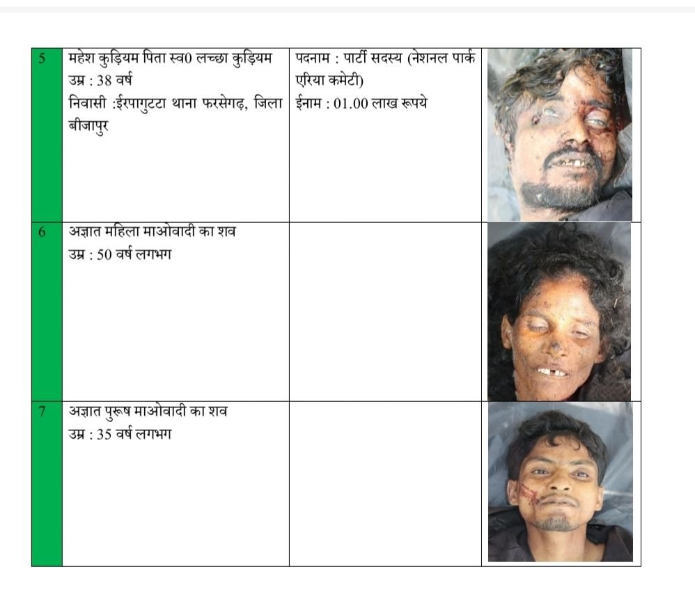 मारे गये माओवादियों में 05 माओवादियों की शिनाख्त पूर्ण हुई है, शेष माओवादियों की शिनाख्तगी कार्यवाही जारी है ।