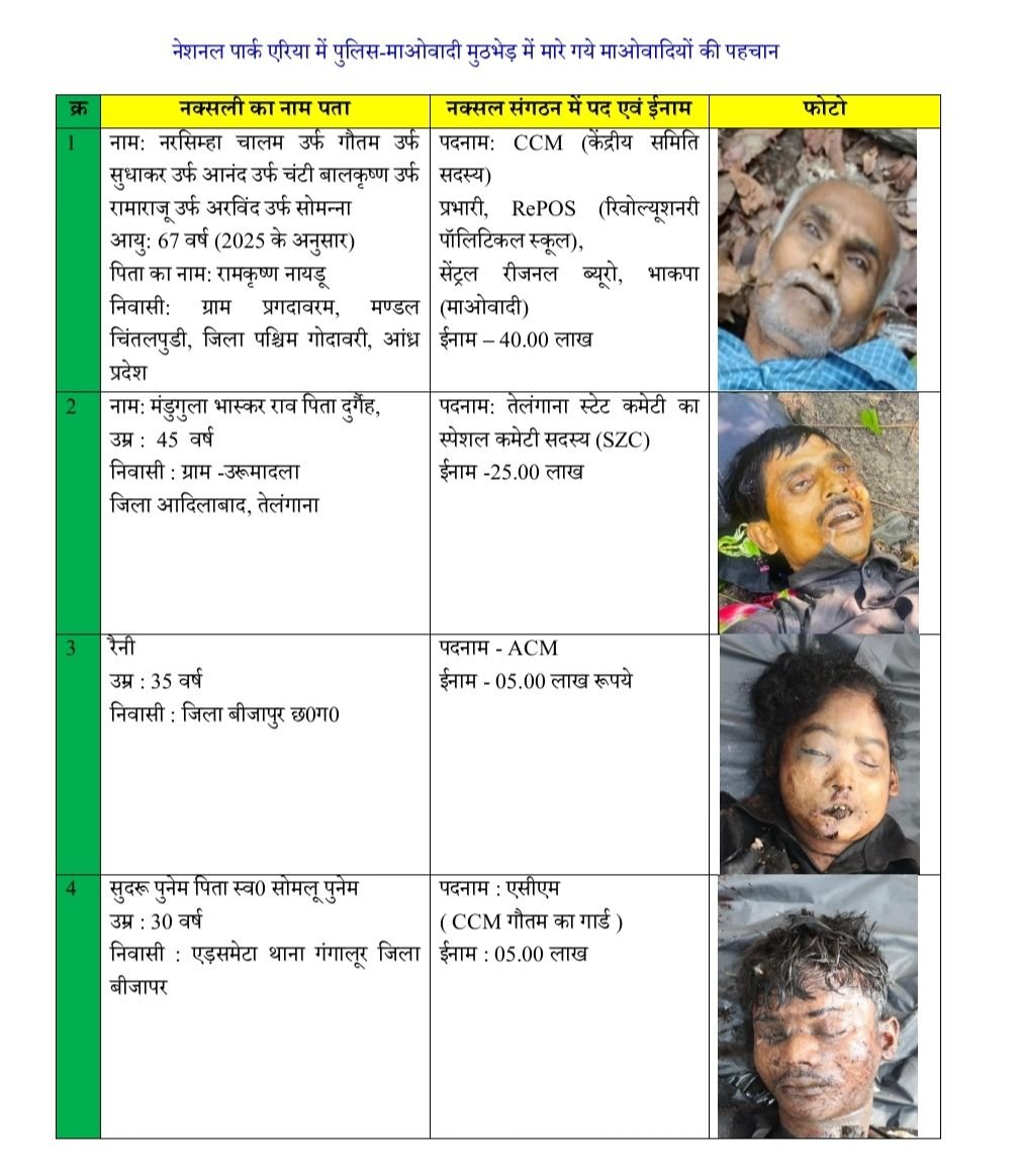 स्तर 11 जून2025 :-  उल्लेखनीय है कि सीपीआई (माओवादी) को बड़ा झटका देते हुए, केन्द्रीय समिति के सदस्य CCM गौतम उर्फ सुधाकर और तेलंगाना स्टेट कमेटी SZC भास्कर राव को डीआरजी, एसटीएफ एवं कोबरा की संयुक्त टीमों ने नेशनल पार्क क्षेत्र के जंगलों में हुए पुलिस-माओवादियों के बीच मुठभेड़ में मार गिराया।