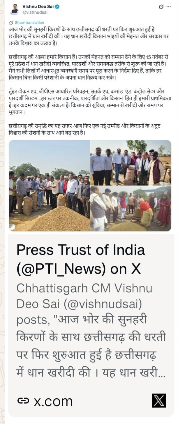 छत्तीसगढ़ में धान खरीदी प्रारंभ…किसानों की मेहनत का सम्मान हमारा संकल्प – मुख्यमंत्री विष्णु देव साय