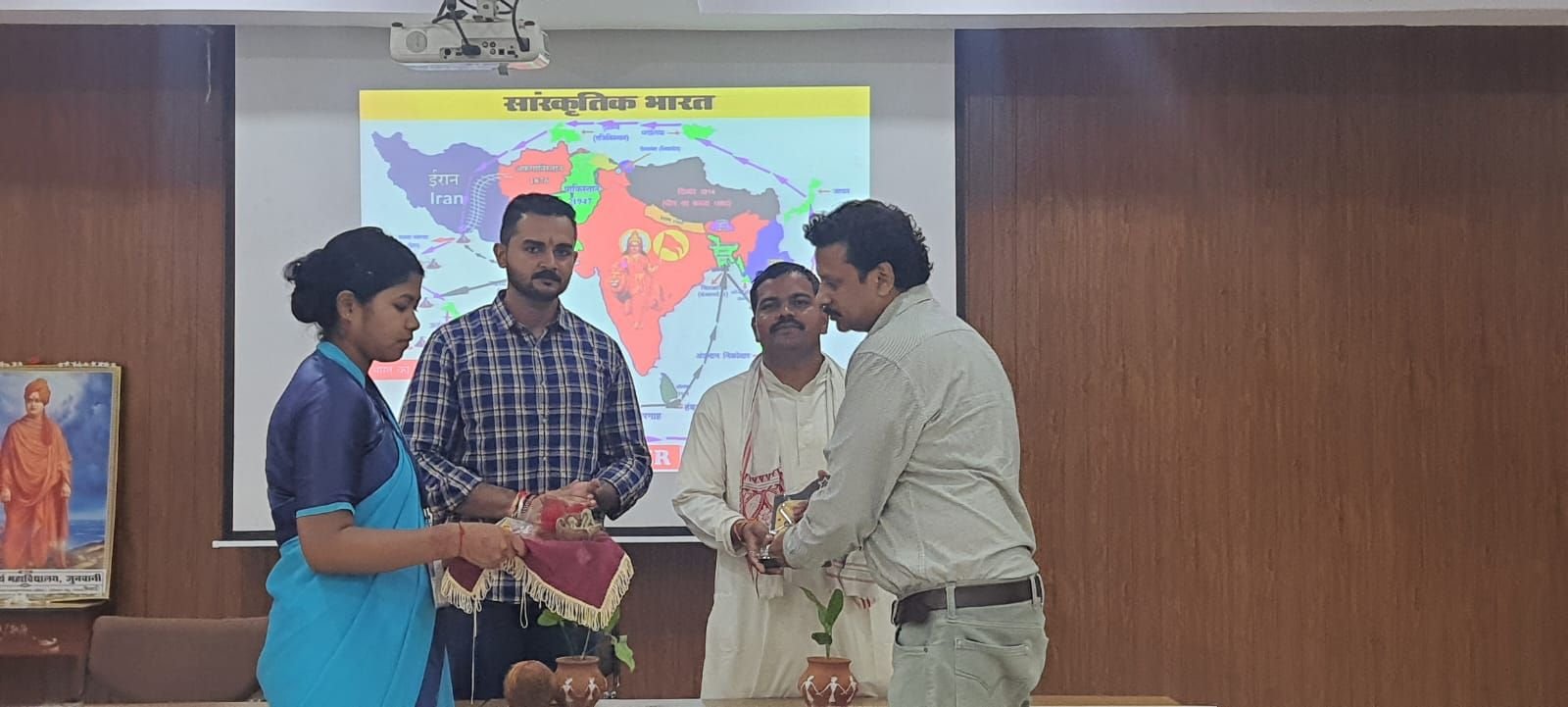 कार्यक्रम का शुभारंभ मां सरस्वती एवं स्वामी विवेकानंद जी के तैल चित्र पर माल्यार्पण कर एवं दीप प्रज्वलित कर किया गया। तत्पश्चात अतिथियों का स्वागत महाविद्यालय की परंपरा अनुसार स्वागत गान और पौधे एवं श्रीफल से बने गणेश से किया गया। कार्यक्रम को गति प्रदान करते हुए मुख्य वक्ता श्री दिलेश्वर उमरे जी ने अपना व्याख्यान भारत की उत्पत्ति, अस्तित्व और नामकरण से करते हुए स्वामी रामतीर्थ स्वामी विवेकानंद जैसे अनेक महापुरुषों के योगदान को स्मरण कर किया। उन्होंने भारत के सांस्कृतिक विरासत का उल्लेख करते हुए बताया कि हमारी भारतीय संस्कृति का विस्तार ईरान से लेकर जापान तक, मंगोलिया से लेकर श्रीलंका तक और बर्मा से लेकर कंबोडिया तक है। विश्व का सबसे प्राचीन और विशाल विष्णु मंदिर कंबोडिया में स्थित है और आज हम वर्तमान में अयोध्या में राम मंदिर का निर्माण बहुत ही संघर्ष के बात कर पाए हैं। भारत की संस्कृति गंगा जमुनी संस्कृति कहलाती है अतः आज पुनः इतिहास लेखन की आवश्यकता है।