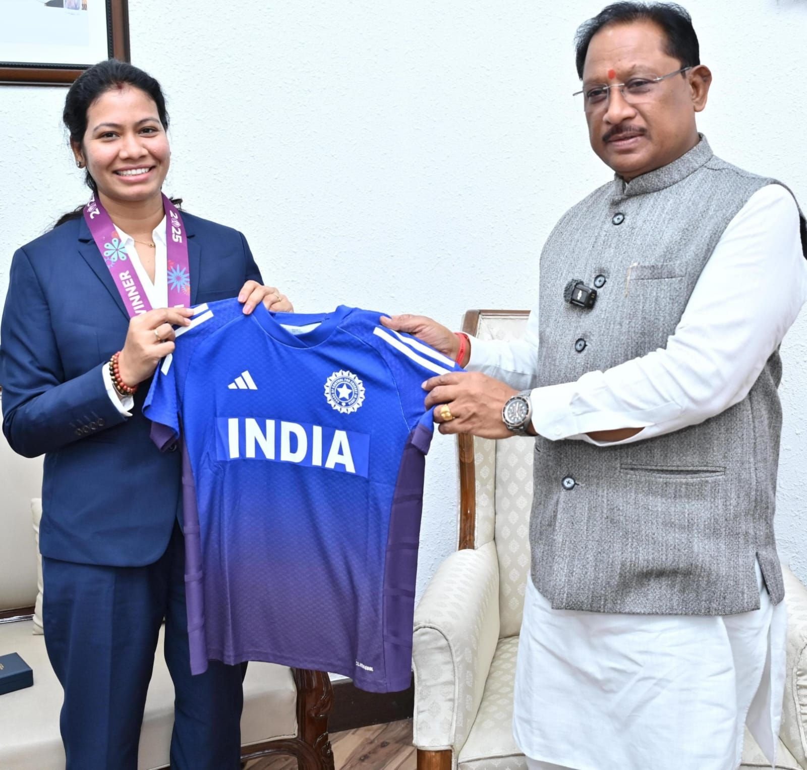 इस अवसर पर आकांक्षा ने मुख्यमंत्री को भारतीय महिला टीम की जर्सी भेंट की और वर्ल्ड कप अभियान की कुछ रोचक यादें साझा कीं।