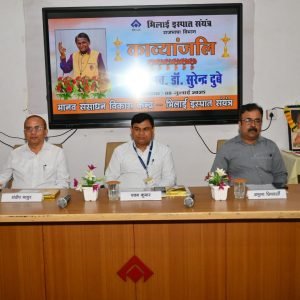 भिलाई नगर 08 जुलाई 2025:- भिलाई इस्पात संयंत्र के राजभाषा विभाग द्वारा 08 जुलाई 2025 को मानव संसाधन विकास केन्द्र के मिनी असेंबली हॉल में छत्तीसगढ़ के अंतरराष्ट्रीय ख्याति प्राप्त कवि, पद्मश्री स्व. डॉ. सुरेन्द्र दुबे को कार्यक्रम ‘काव्यांजलि’ का आयोजन कर काव्यमय श्रद्धांजलि अर्पित की गई। कार्यक्रम में भिलाई इस्पात संयंत्र के कार्यपालक निदेशक (मानव संसाधन) पवन कुमार, मुख्य महाप्रबंधक (मानव संसाधन) संदीप माथुर उपस्थित थे।