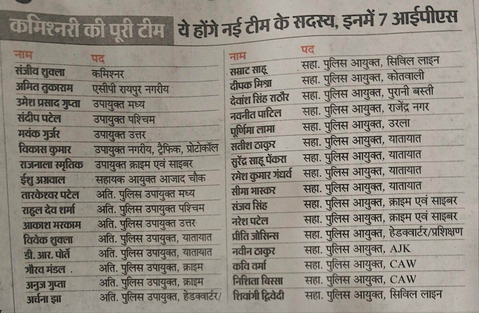 राज्य शासन ने 23 जनवरी से कमिश्नरी लागू होने के पहले बिलासपुर आईजी संजीव शुक्ला को रायपुर के पहले पुलिस कमिश्नर जिम्मेदारी सौंपी है। आईपीएस की अमित तुकाराम । को एडिशनल कमिश्नर बनाया गया है। इसके साथ ही कमिश्नरी सिस्टम के हिसाब से बंटे शहर में तीन उपायुक्तों की पोस्टिंग आदेश भी जारी कर दिए गए हैं। ट्रैफिक और क्राइम एवं साइबर के लिए भी उपायुक्तों की नियुक्ति की गई है।