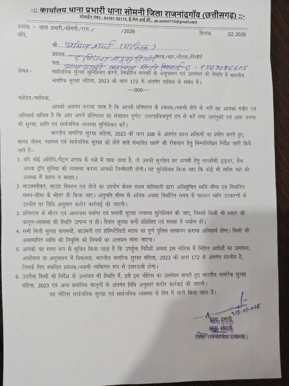 राजनांदगांव 29 जनवरी 2026:- कानून-व्यवस्था को सुदृढ़ बनाए रखने, असामाजिक गतिविधियों पर प्रभावी अंकुश लगाने तथा सार्वजनिक शांति सुनिश्चित करने के उद्देश्य से जिला पुलिस द्वारा मनगटा क्षेत्र में स्थित रिसॉर्ट्स पर एक साथ कई टीमों द्वारा सघन दबिश एवं छापेमारी की कार्रवाई की गई।