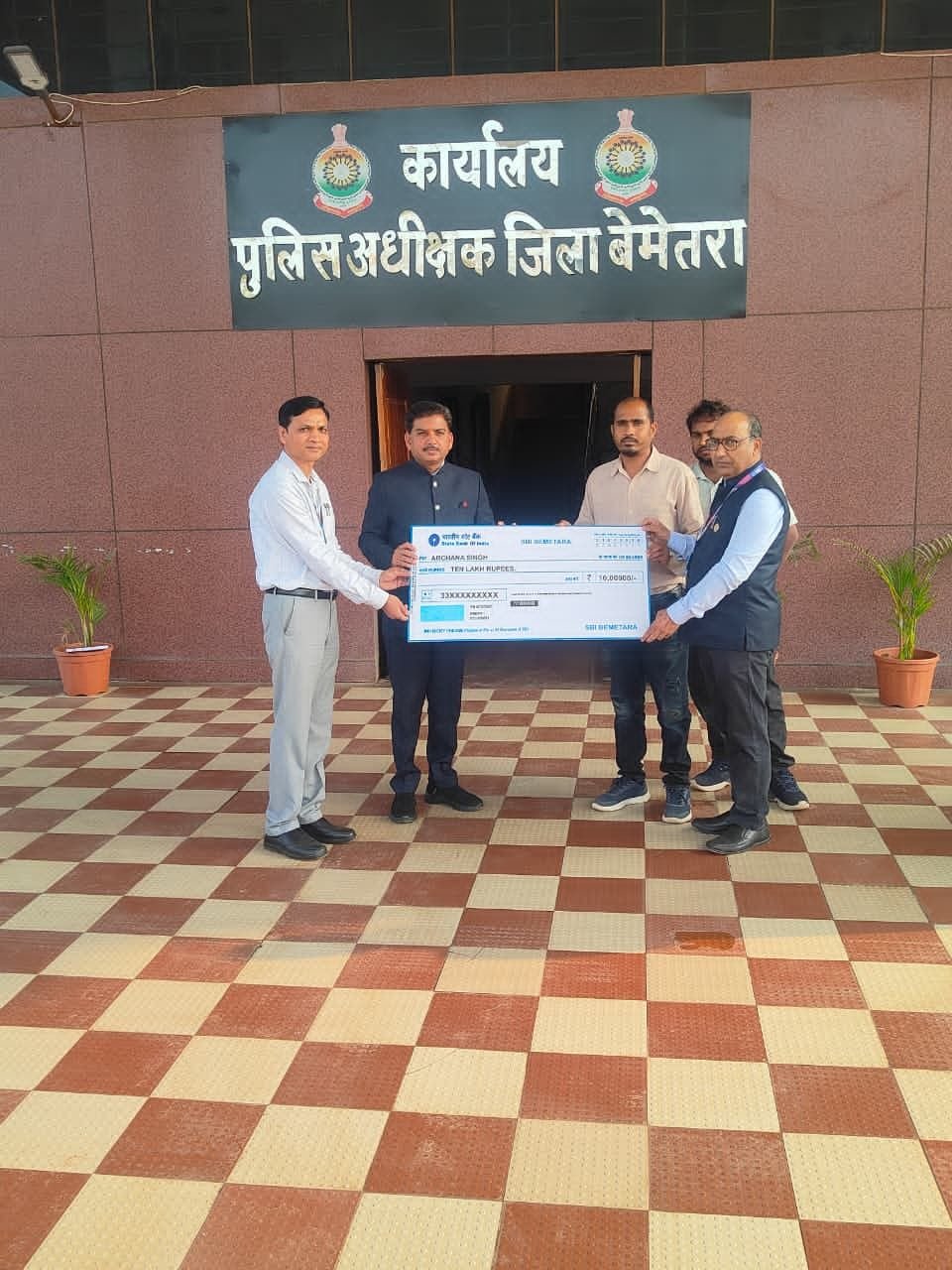एसएसपी बेमेतरा रामकृष्ण साहू (IPS) एवं भारतीय स्टेट बैंक क्षेत्रीय प्रबंधक बलौदाबाजार व मुख्य प्रबंधक बेमेतरा द्वारा दिवंगत पुलिस कर्मियों के परिजनों को किया गया चेक प्रदान।
