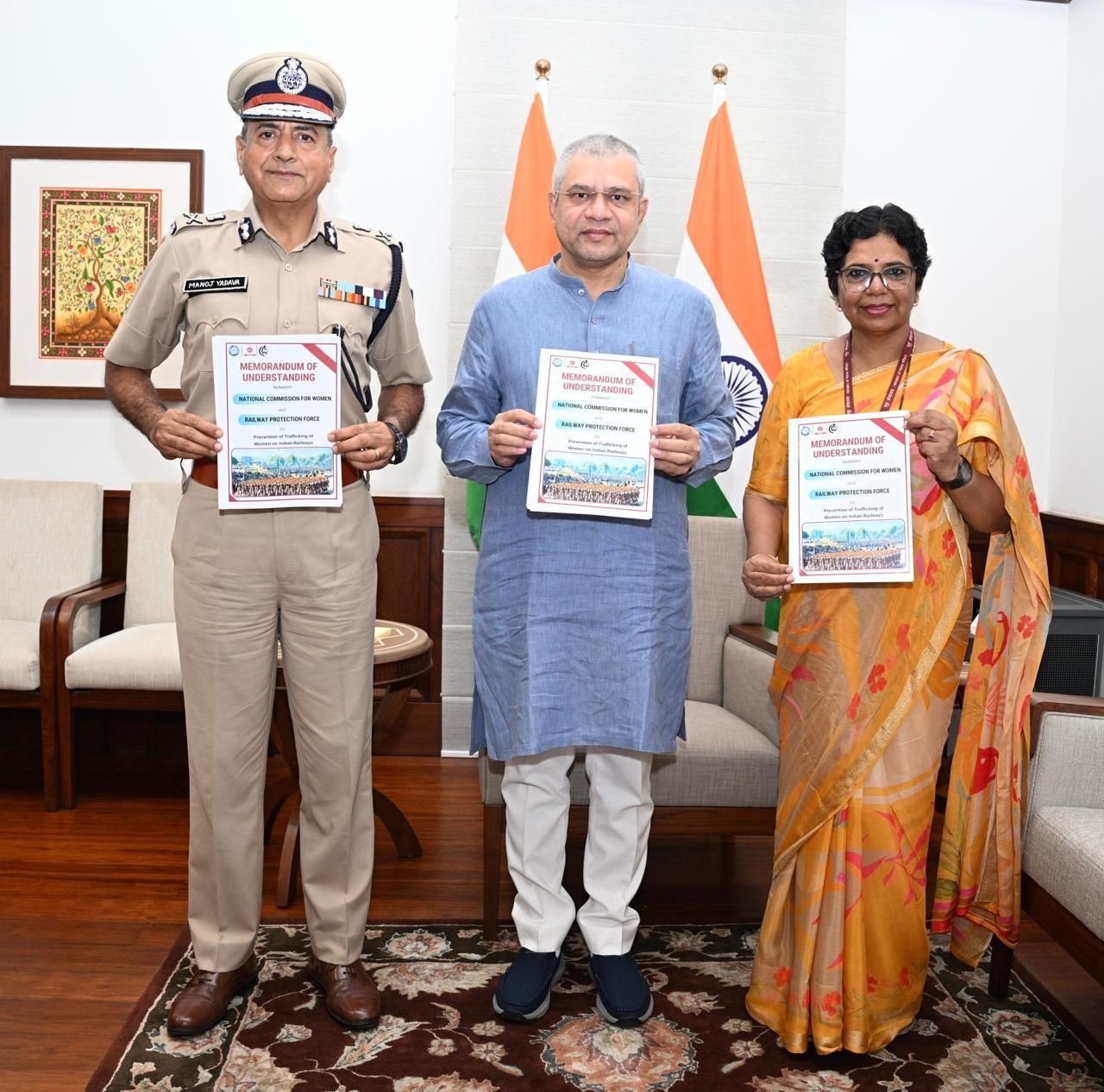यह एमओयू राष्ट्रीय महिला आयोग की उप सचिव श्रीमती शिवानी डे एवं रेलवे सुरक्षा बल के डीआईजी/प्रोजेक्ट्स एस. सुधाकर द्वारा हस्ताक्षरित किया गया। इस अवसर पर राष्ट्रीय महिला आयोग द्वारा तैयार की गई मानव तस्करी विरोधी एक विशेष पुस्तिका का भी विमोचन किया गया ।