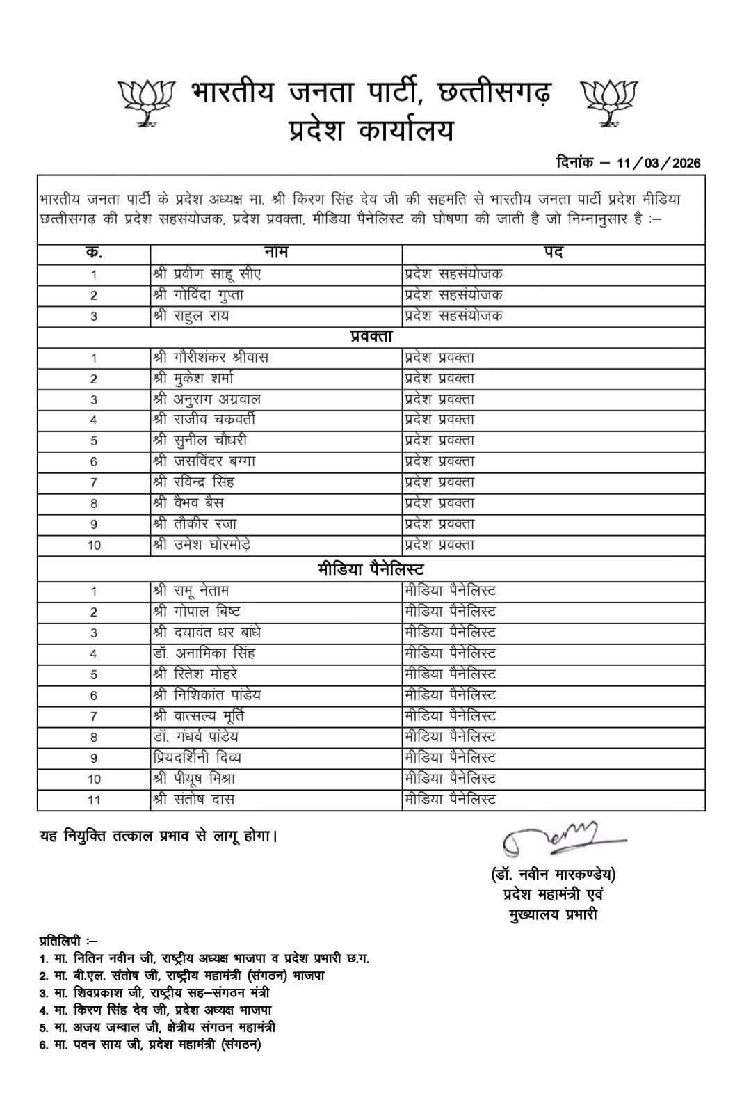 रायपुर 13 मार्च 2026:- भारतीय जनता पार्टी के प्रदेश अध्यक्ष  किरण सिंह देव  की सहमति से प्रदेश महामंत्री मुख्यालय प्रभारी डॉ नवीन मार्कंडेय ने भारतीय जनता पार्टी प्रदेश मीडिया छत्तीसगढ़ की  03 प्रदेश सहसंयोजक, 10 प्रदेश प्रवक्ता, 11 मीडिया पैनेलिस्ट की घोषणा की है। 11 मीडिया पैनेलिस्ट में  MBBS, MS स्त्री रोग विशेषज्ञ , रानी दुर्गावती वार्ड – 49 की  पार्षद, रायपुर नगर निगम एमआइसी सदस्य, डॉ अनामिका सिंह चौहान को शामिल किया गया है।