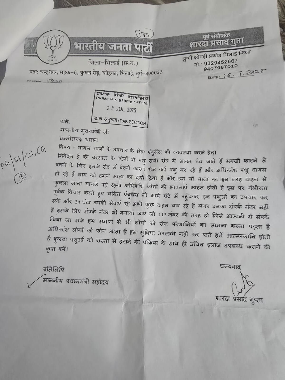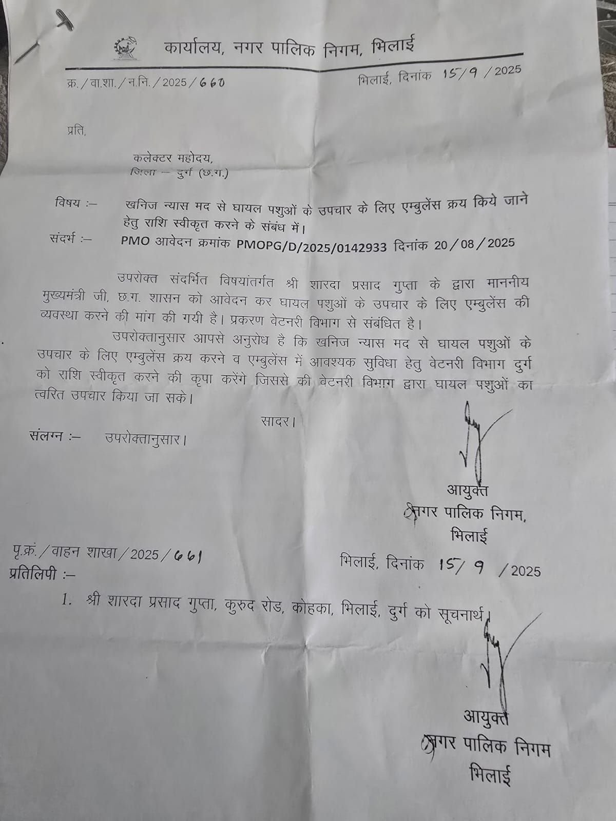 भिलाई नगर 28, सितंबर 2025:- भाजपा पूर्व संयोजक झुग्गी झोपड़ी प्रकोष्ठ के संयोजक शारदा गुप्ता ने घायल गायों के उपचार के लिए एंबुलेंस की व्यवस्था करने की मांग हेतु प्रधानमंत्री कार्यालय को पत्राचार किया था जिसे प्रधानमंत्री कार्यालय से कलेक्टर को निर्देशित किया गया है कि घायल पशुओं के उपचार हेतु एंबुलेंस की व्यवस्था की जाए।