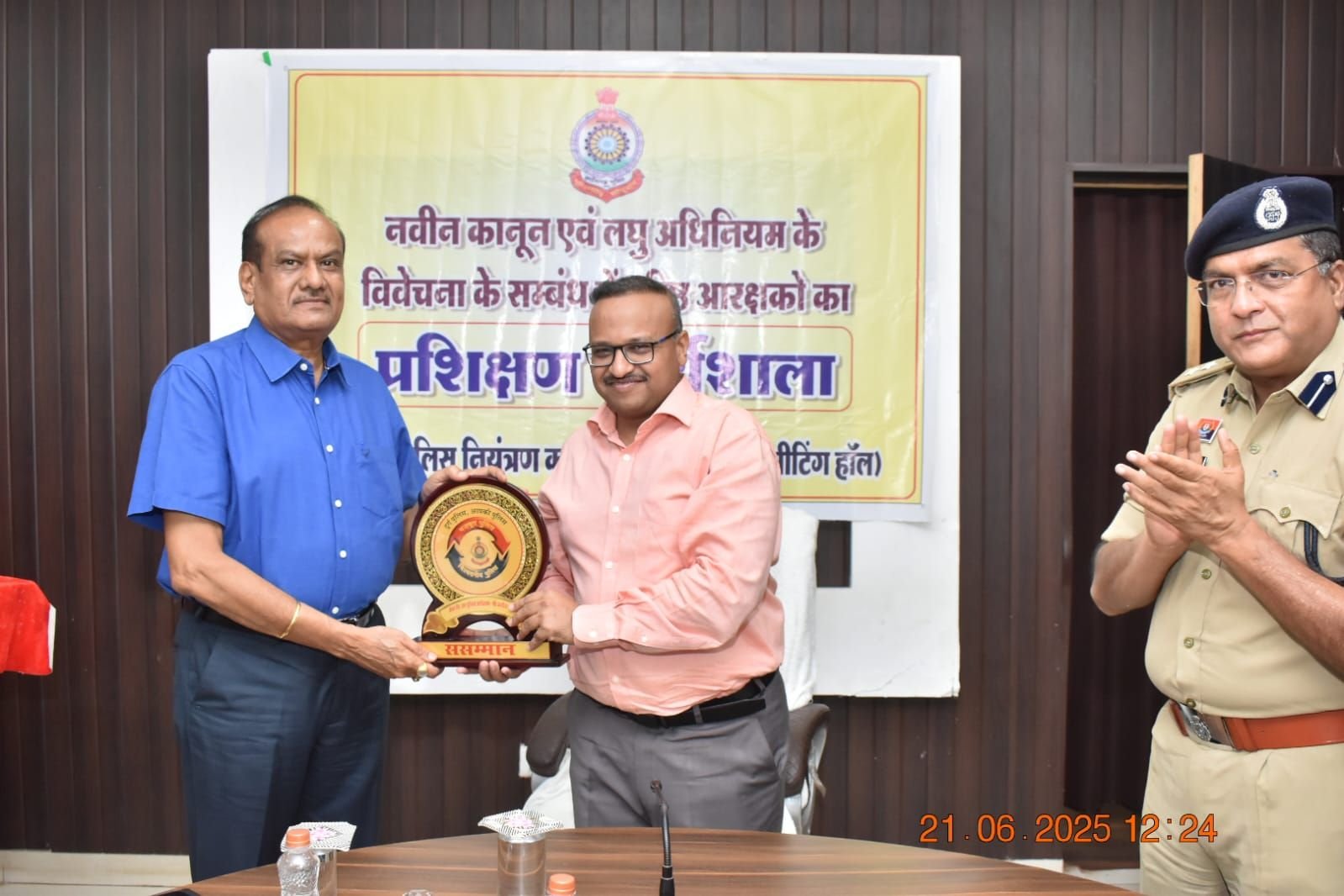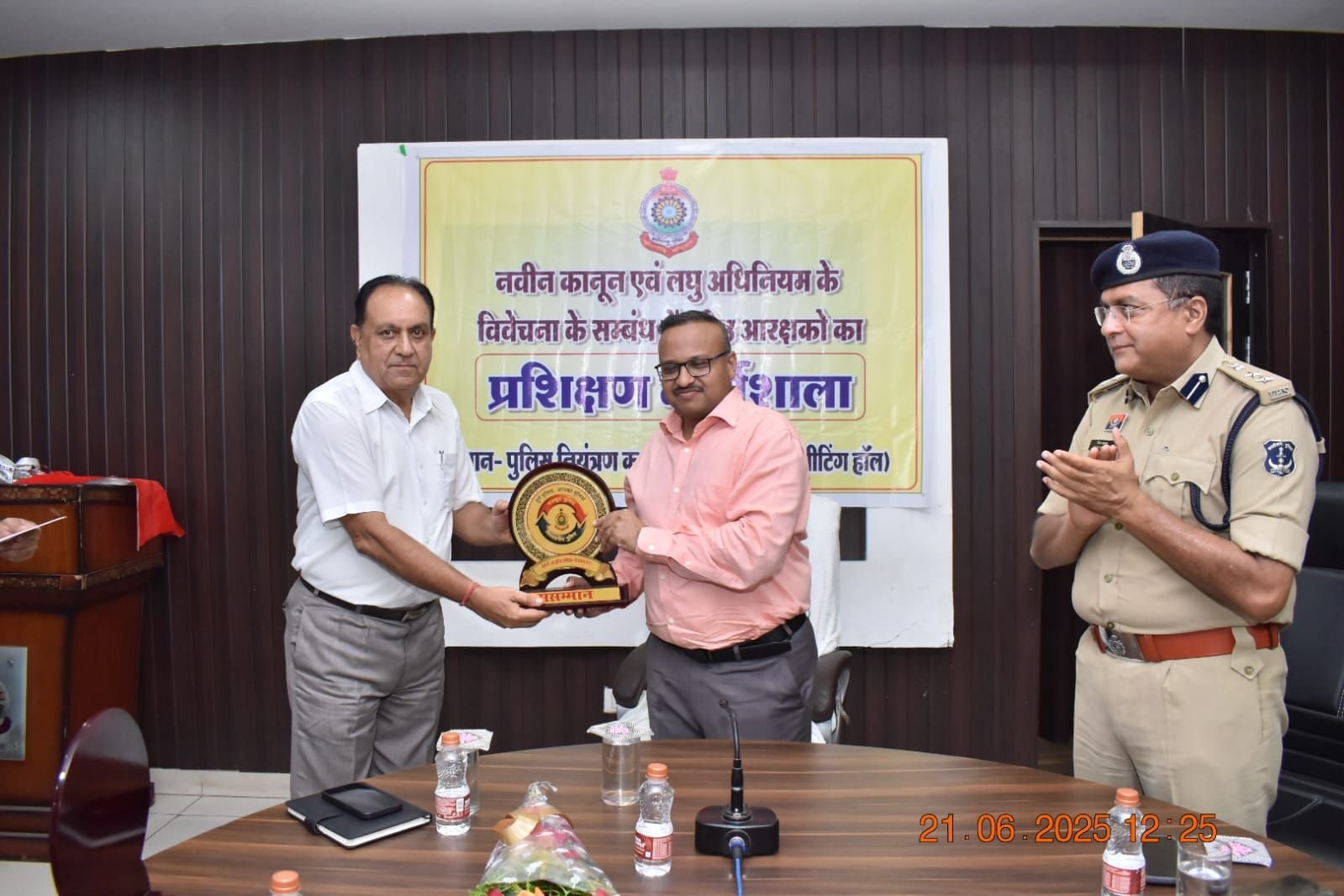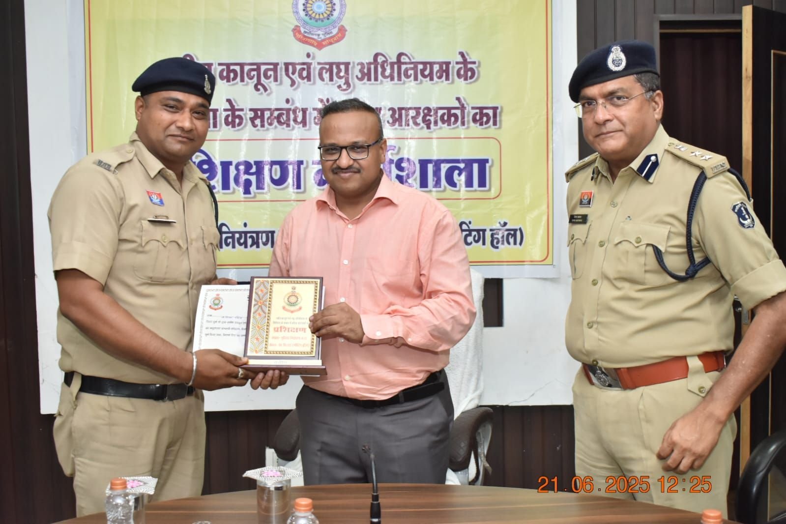 एवं 21.06.2025 को प्रशिक्षणार्थियों की परीक्षा आयोजित की जाकर प्रशिक्षण में प्रथम स्थान-आरक्षक कमांक 971 उत्तम कुमार देशमुख, थाना रानीतराई, द्वितीय स्थान आरक्षक कमांक 1677 बी. लक्ष्मण राव , चौकी अंजोरा, एवं तृतीय स्थान-आरक्षक कमांक 1612 श्याम सिंह राजपूत, चौकी-जेवरासिरर्सा प्राप्त करने वाले प्रक्षिक्षणार्थियों को पुलिस *महानिरीक्षक, दुर्ग रेंज, दुर्ग, श्री रामगोपाल गर्ग, भापुसे. वरिष्ठ पुलिस अधीक्षक, दुर्ग श्री विजय अग्रवाल भा.पु.से. द्वारा पुरूस्कृत किया गया एवं अजीत यादव सेवानिवृत्त उप पुलिस अधीक्षक एवं श्री राकेश जोशी सेवानिवृत्त उप पुलिस अधीक्षक दुर्ग को मोमेंटो भेंट किया गया।