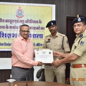 भिलाई नगर 21 जून 2025:- आज 21 जून को वरिष्ठ आरक्षकों के अनुसंधान संबंधी प्रक्षिक्षण का समापन समारोह आयोजित था जिसमें पुलिस महानिरीक्षक, दुर्ग रेंज, दुर्ग, रामगोपाल गर्ग, वरिष्ठ पुलिस अधीक्षक, दुर्ग विजय अग्रवाल उपस्थित थे। 16 से 20 जून को जिला दुर्ग में पदस्थ वरिष्ठ आरक्षकों की अनुसंधान संबंधी प्रशिक्षण सह-कार्यशला का 5 दिवसीय आयोजन पुलिस नियंत्रण कक्ष, सेक्टर-6 मिलाई नगर में आयोजित किया गया है,