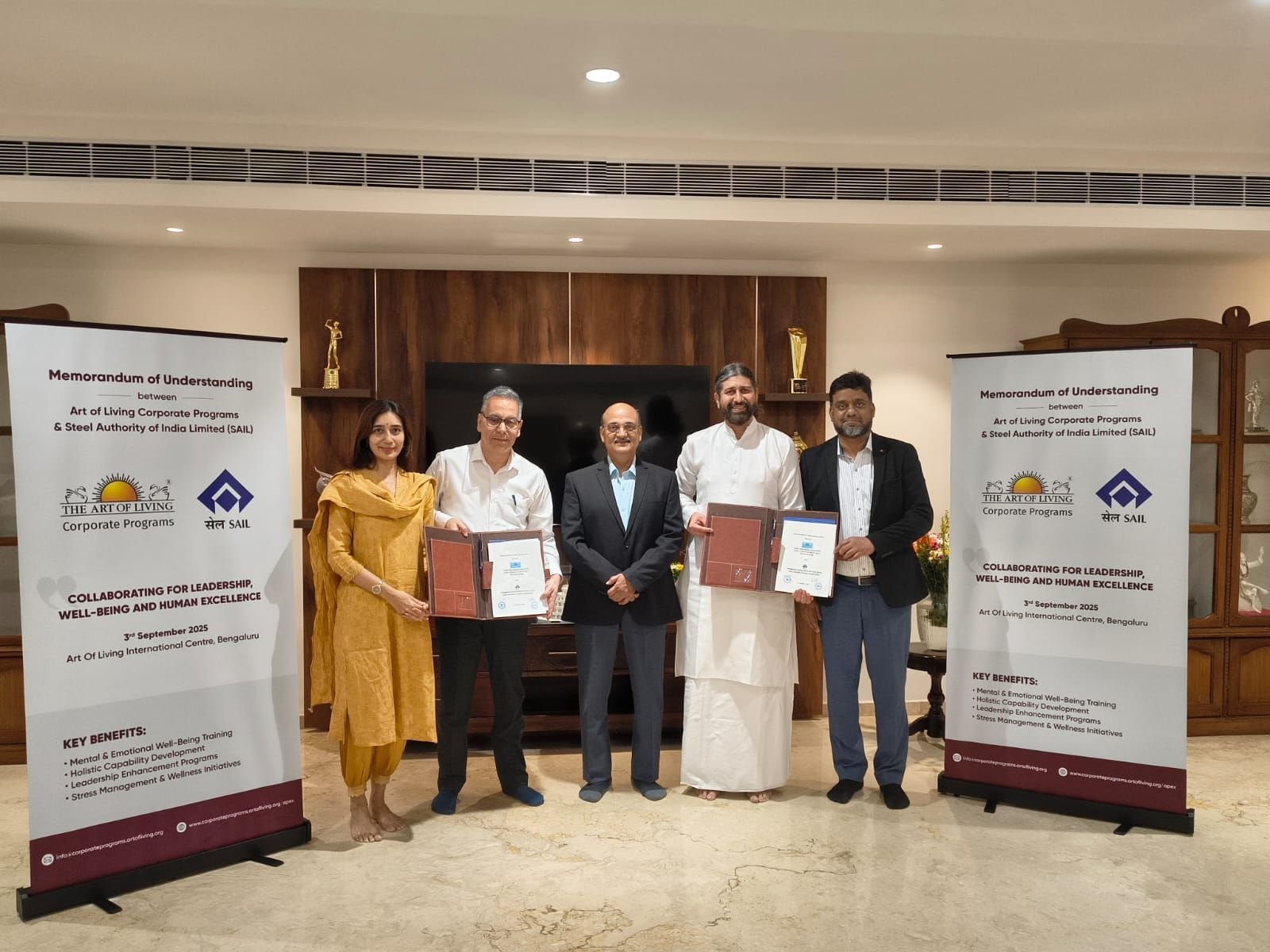 नई दिल्ली, 04 सितंबर, 2025:- स्टील अथॉरिटी ऑफ़ इंडिया लिमिटेड (सेल) और आर्ट ऑफ़ लिविंग ने सेल कार्मिकों के बीच Holistic Well-Being को बढ़ावा देने के लिए एक समझौता ज्ञापन पर हस्ताक्षर किया है। इस समझौता ज्ञापन को सेल के निदेशक (कार्मिक) के.के. सिंह की उपस्थिति में, सेल – प्रबंध प्रशिक्षण संस्थान (एमटीआई) के कार्यकारी कार्यपालक निदेशक (मानव संसाधन – ज्ञानार्जन एवं विकास) संजय धर और आर्ट ऑफ़ लिविंग के व्यक्ति विकास केंद्र इंडिया (वीवीकेआई) के अध्यक्ष ब्र. प्रज्ञाचैतन्य ने बेंगलुरु के आर्ट ऑफ़ लिविंग इंटरनेशनल सेंटर में 03 सितंबर, 2025 को हस्ताक्षर किए।