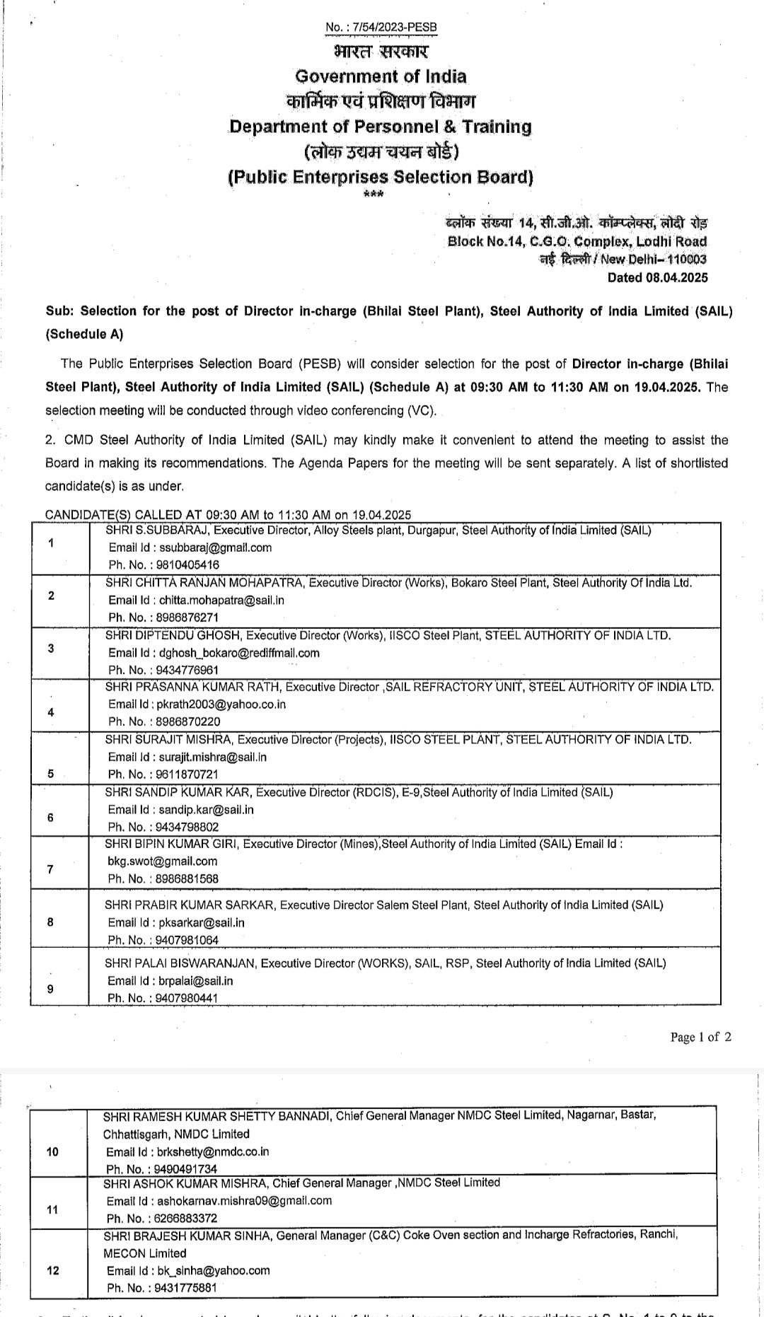 साक्षात्कार के बाद बोकारो स्टील प्लांट में वर्तमान में अधिशासी निदेशक (वर्क्स) के पद पर कार्यरत चितरंजन महापात्र को भिलाई स्टील प्लांट का निदेशक प्रभारी नियुक्त करने की सिफारिश की गई है। वहीं, इस्को स्टील प्लांट, बर्नपुर में अधिशासी निदेशक (प्रोजेक्ट्स) पद पर कार्यरत सुरजीत मिश्रा दुर्गापुर स्टील प्लांट का निदेशक प्रभारी बनाए जाने की सिफारिश की गई है।
