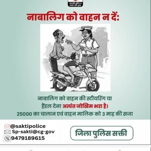 18 वर्ष के कम उम्र के बच्चों को वाहन चलाने के लिए न देंवे, अन्यथा वाहन चालक के साथ – साथ वाहन मालिक के विरूद्ध भी मोटर व्हीकल एक्ट के तहत वाहन जप्त कर वैधानिक कार्यवाही की जायेगी।