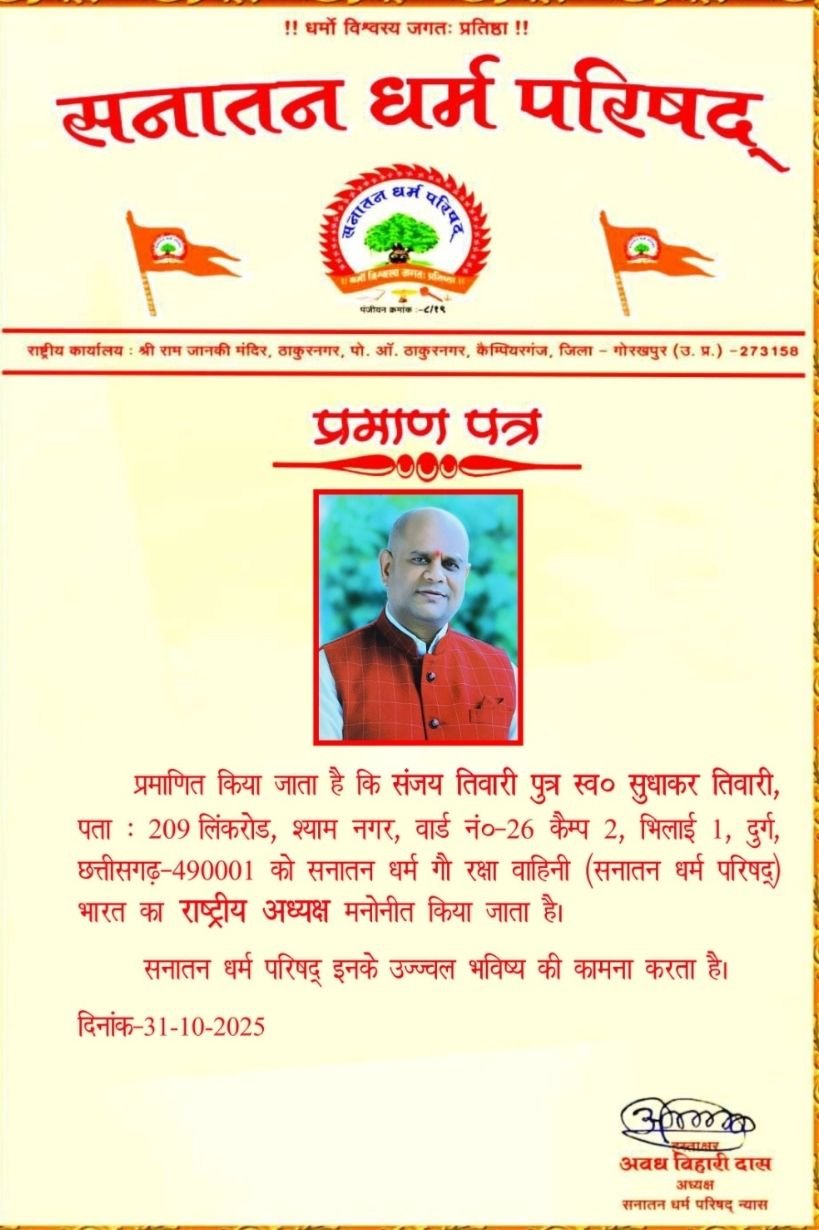 भिलाई नगर 03 नवंबर 2025:- एस आर हॉस्पिटल एंड कॉलेज चिखली दुर्ग छग के चेयरमेन व समाज सेवी संजय तिवारी को बड़ी जिम्मेदारी मिली है। उन्हें सनातन धर्म परिषद् न्यास की शाखा सनातन धर्म गौ रक्षा वाहिनी का राष्ट्रीय अध्यक्ष नियुक्त किया गया है। सनातन धर्म परिषद् न्यास के अध्यक्ष अवध बिहारी दास ने उन्हें यह महत्तवपूर्ण जिम्मेदारी प्रदान की है।